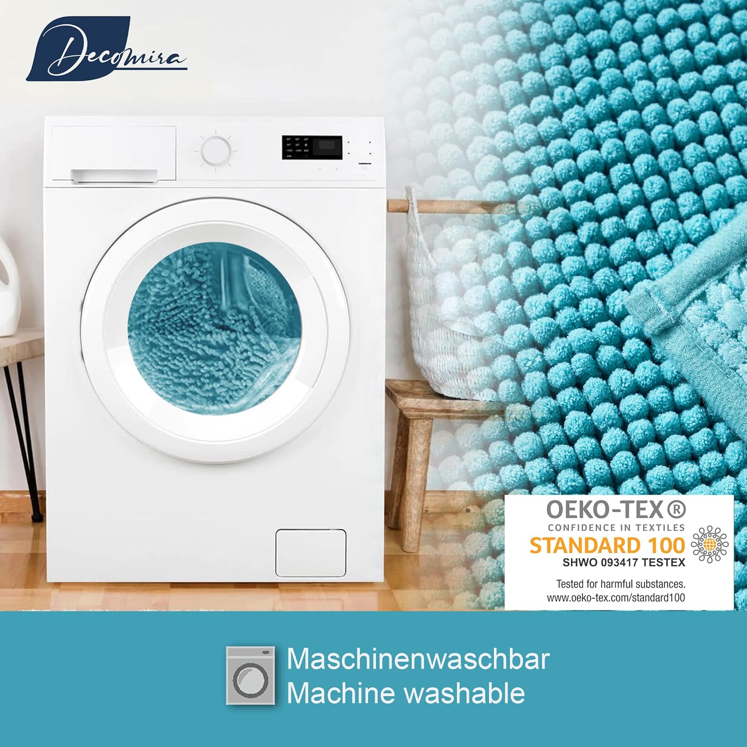 Килимчетата за баня Decomira са изработени от висококачествен шенил със сертификат Oeko-Tex 100 (SHWO 093417 TESTEX). Материалът е супер мек, абсорбиращ и щадящ кожата. Реактивният процес на боядисване осигурява устойчивост на цветовете на килимчетата за баня.