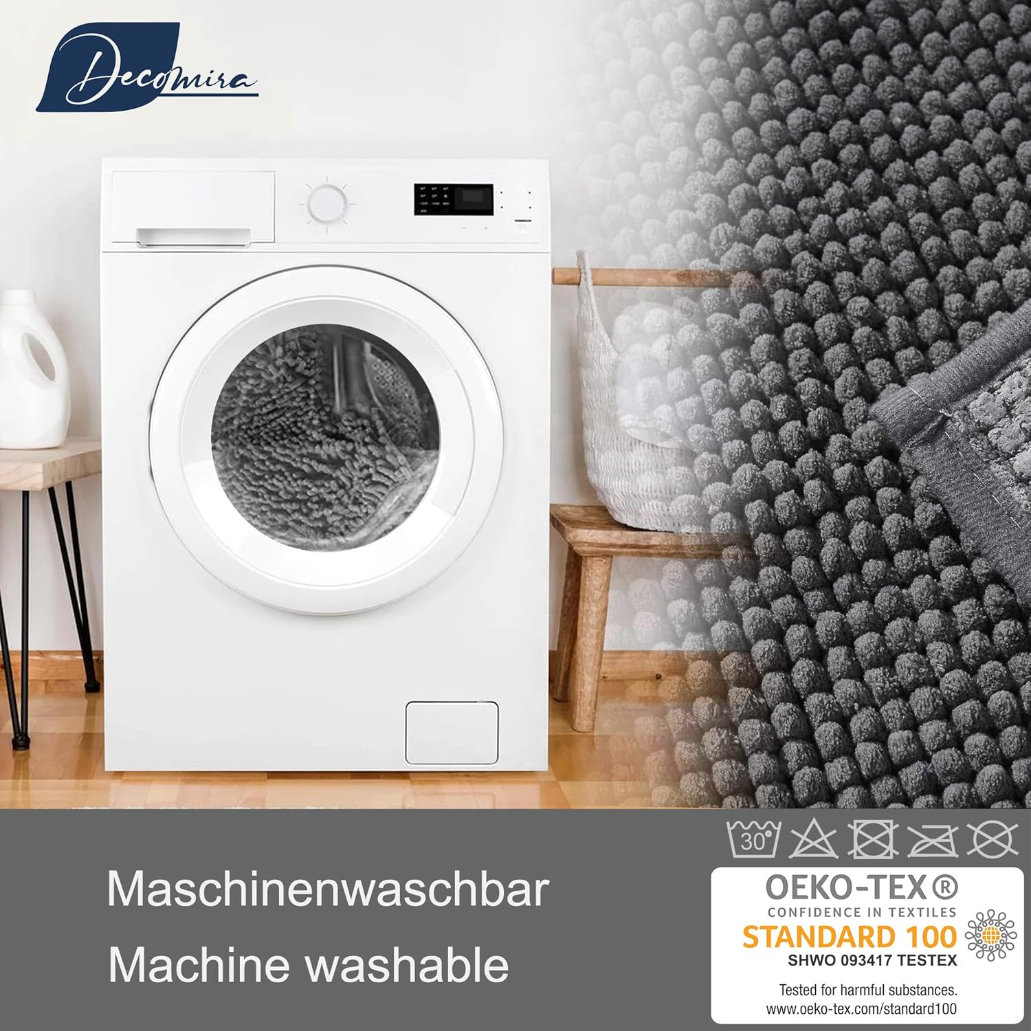 Постелките за баня Decomira са изработени от висококачествен и издръжлив материал. Плътният косъм и шевовете остават визуално и функционално непокътнати дори след многократно пране.