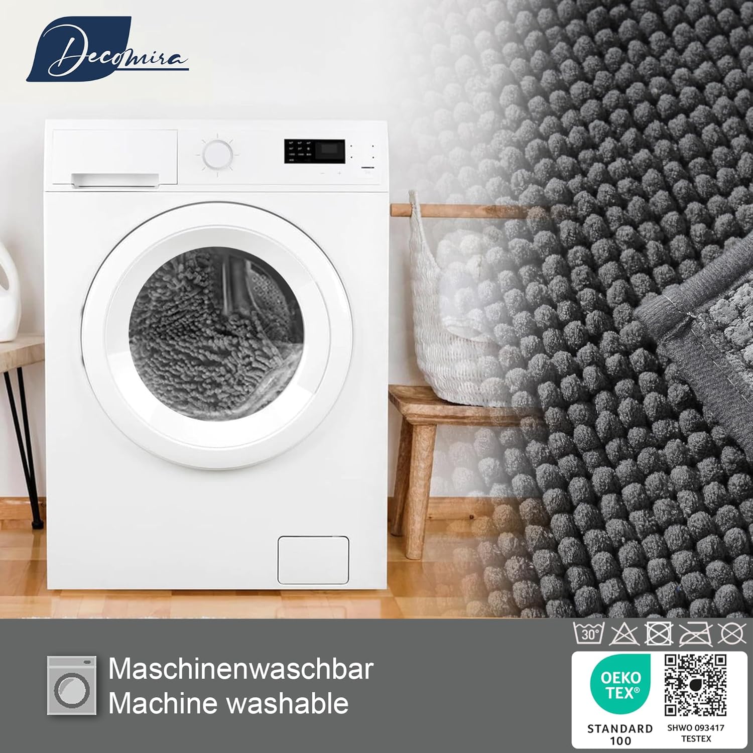Постелките за баня Decomira са изработени от висококачествен и издръжлив материал. Плътният косъм и шевовете остават визуално и функционално непокътнати дори след многократно пране.