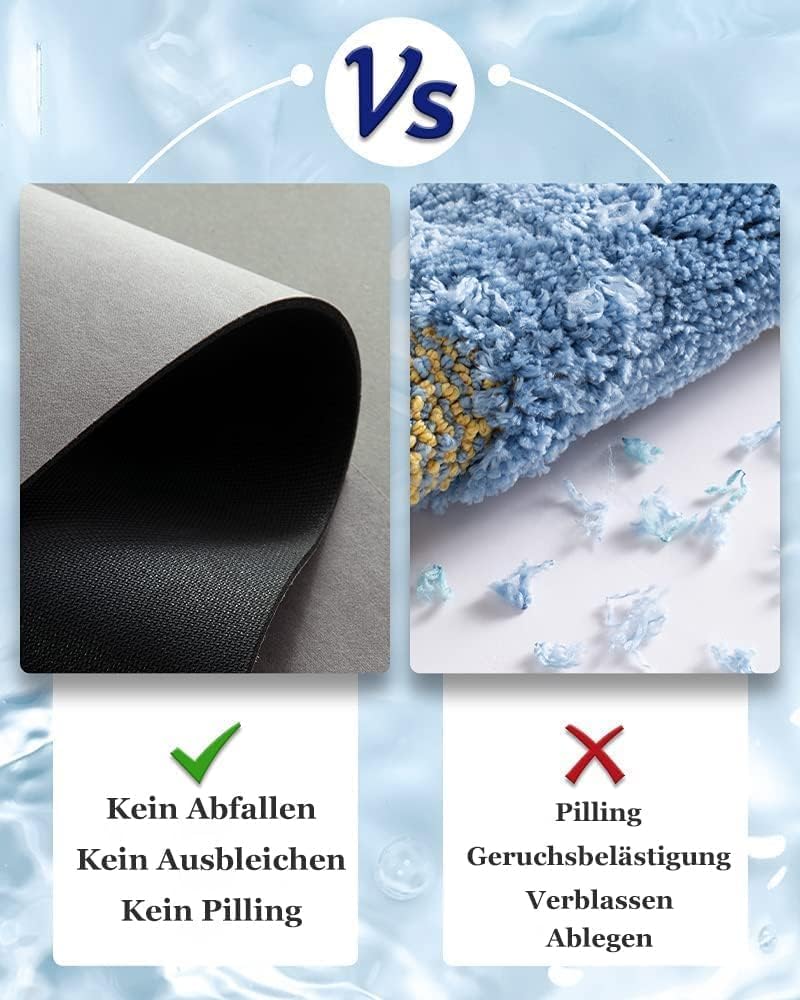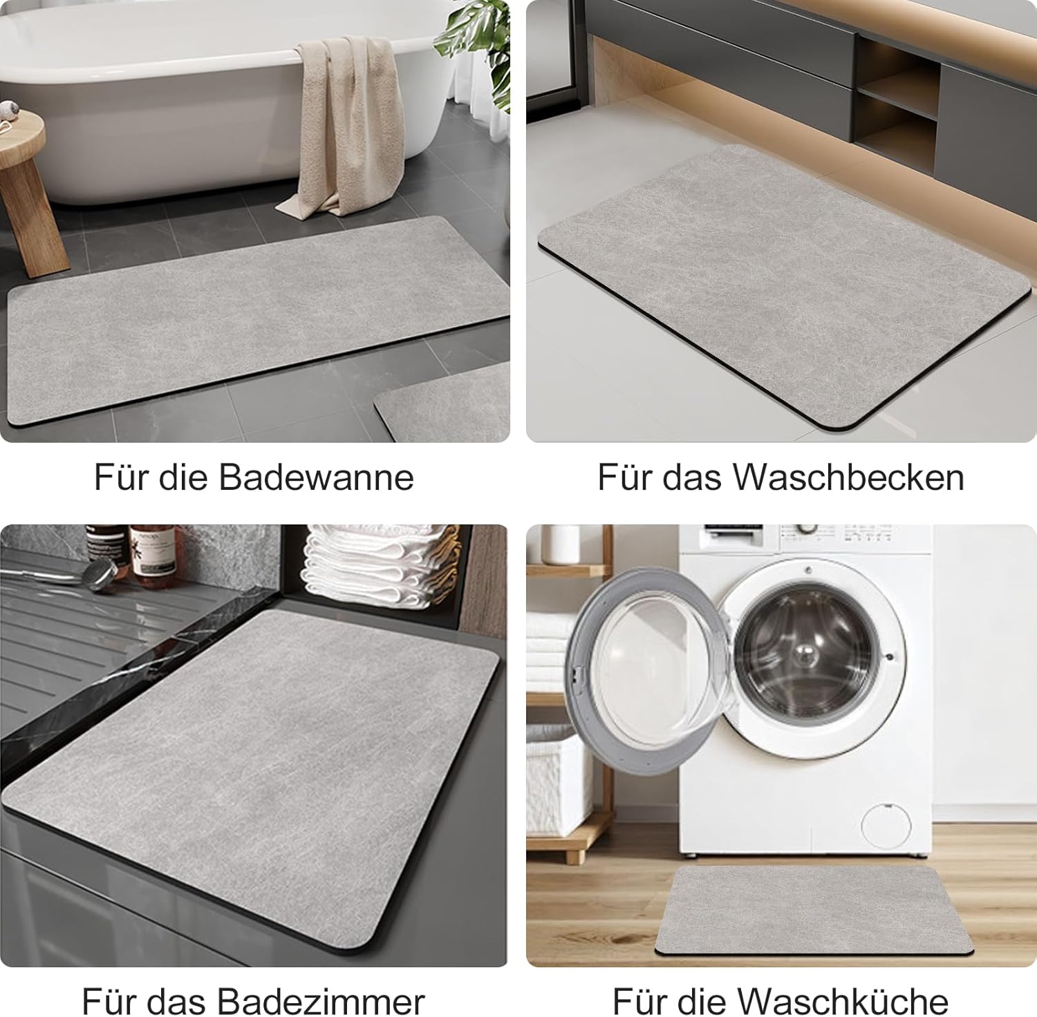 Really absorbent and quick drying – This highly absorbent bath mat has a middle layer of absorbent sponge and diatomaceous earth, which is extremely absorbent. Non-slip mats – These bath mats with rubber backing are designed with a surface made of faux suede, the back is made of rubber. These can prevent slipping and shifting and increase safety and stability. No shedding - These bath mats for the floor are very soft and smooth, unlike traditional chenille rugs for the bathroom. They are more durable and there are no shedding, odours, fading, wearing out or hidden hair. Easy to clean - the smooth surface design helps to resist dirt and hair. Therefore, you do not need to dry or clean the washable bath mats every day. Can be used anywhere - the bath mat is only 4 mm thick, and it will not get stuck in the door opening while it meets foot comfort and water absorption.