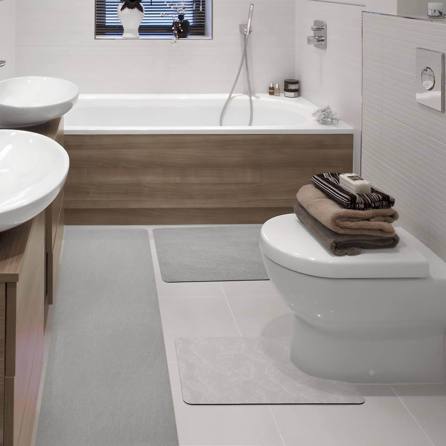 Really absorbent and quick drying – This highly absorbent bath mat has a middle layer of absorbent sponge and diatomaceous earth, which is extremely absorbent. Non-slip mats – These bath mats with rubber backing are designed with a surface made of faux suede, the back is made of rubber. These can prevent slipping and shifting and increase safety and stability. No shedding - These bath mats for the floor are very soft and smooth, unlike traditional chenille rugs for the bathroom. They are more durable and there are no shedding, odours, fading, wearing out or hidden hair. Easy to clean - the smooth surface design helps to resist dirt and hair. Therefore, you do not need to dry or clean the washable bath mats every day. Can be used anywhere - the bath mat is only 4 mm thick, and it will not get stuck in the door opening while it meets foot comfort and water absorption.