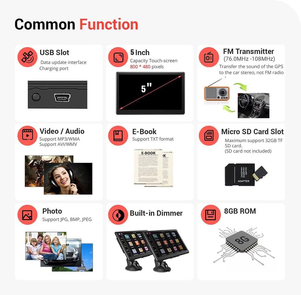 The car navigator is pre-installed with 2025 maps of 52 countries in Europe and the United Kingdom, and the maps are updated free of charge for life Supports 2D/3D map to display remaining distance, estimated arrival time and current pace 33 languages voice detection point and sign warnings for curves, overtaking, etc. (no TMC). Choose from the fastest, most environmentally friendly and easiest routes or alternative routes, add your favorites and waypoints 7 vehicle modes to switch between truck (simply enter length, height, width and weight), car, bus, taxi, bicycle, emergency and pedestrian Thanks to the connection between the FM function of the navigation system and the car radio, loud voice guidance is possible. Specification:| Размер на екрана (инча) | 5 |