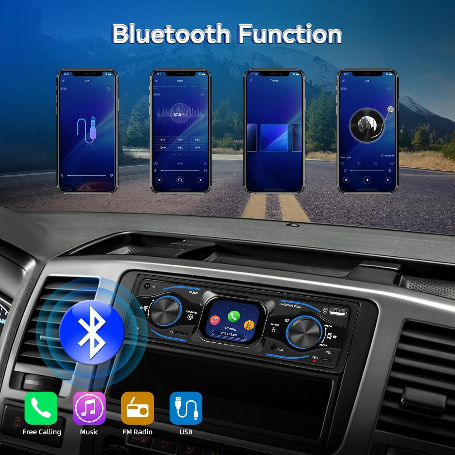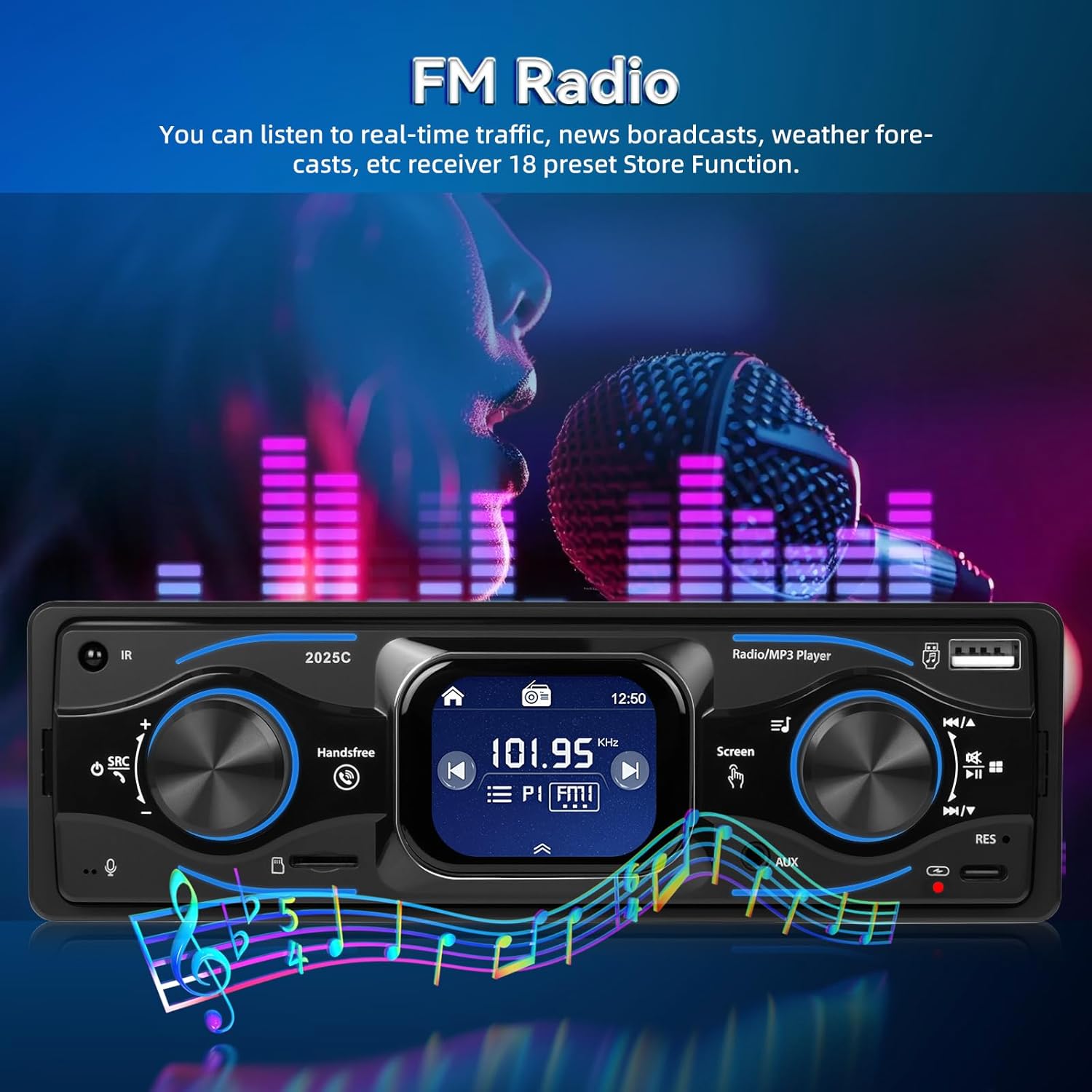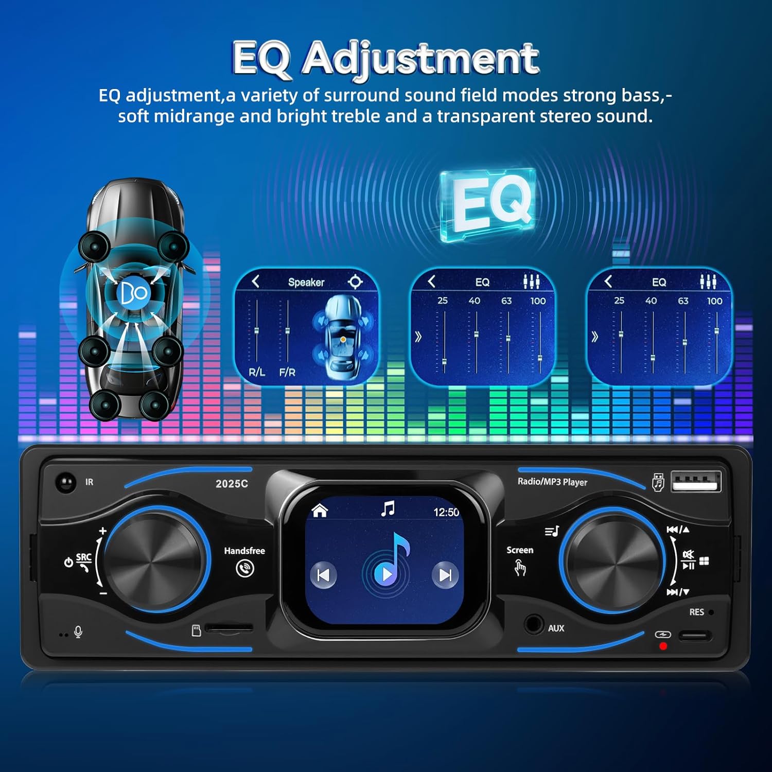 • FM радио и настройка на звука с поддръжка на еквалайзер - Настройте любимите си станции със стабилен FM прием и слотове за памет. Вградените настройки на еквалайзера позволяват пълен контрол на звука - което прави това 1-DIN радио отличен избор за всеки, който цени ясния, индивидуален звук на своя MP3 плейър за колата.