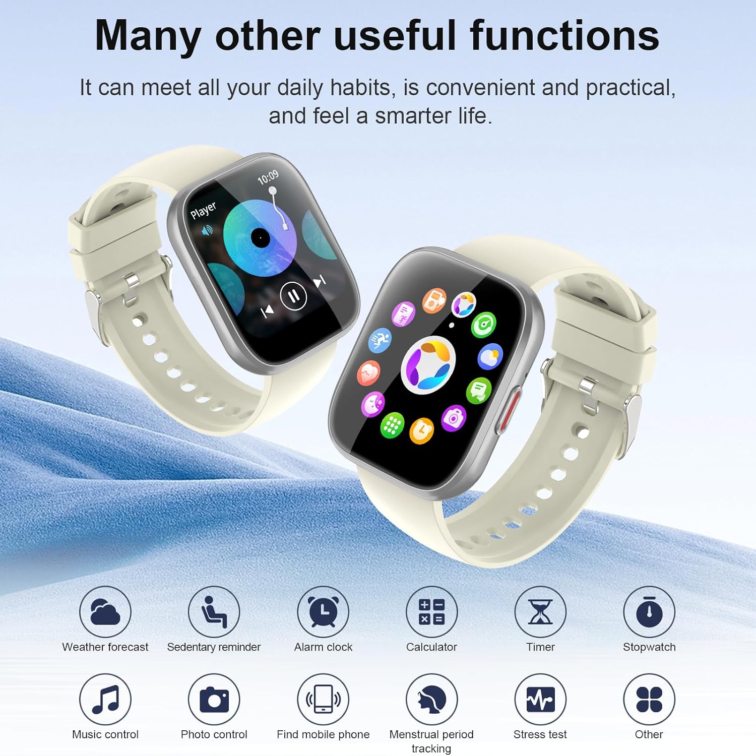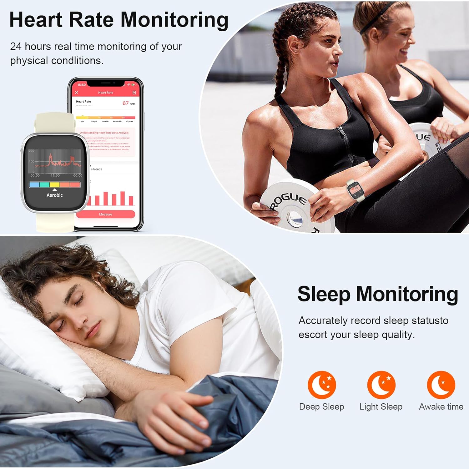 • Монитор за здраве в реално време и множество функции: смарт часовникът е оборудван с мощни сензори за движение и съдържа нова технология за измерване, която проследява сърдечната честота 24 часа в денонощието и състоянието на съня ви, което ви помага да правите разумни корекции в начина си на живот. Фитнес часовниците имат и много практични функции, като прогноза за времето, управление на музика, управление на камерата, напомняне за заседнал начин на живот, будилник, проследяване на женски цикли, намиране на телефон и др.