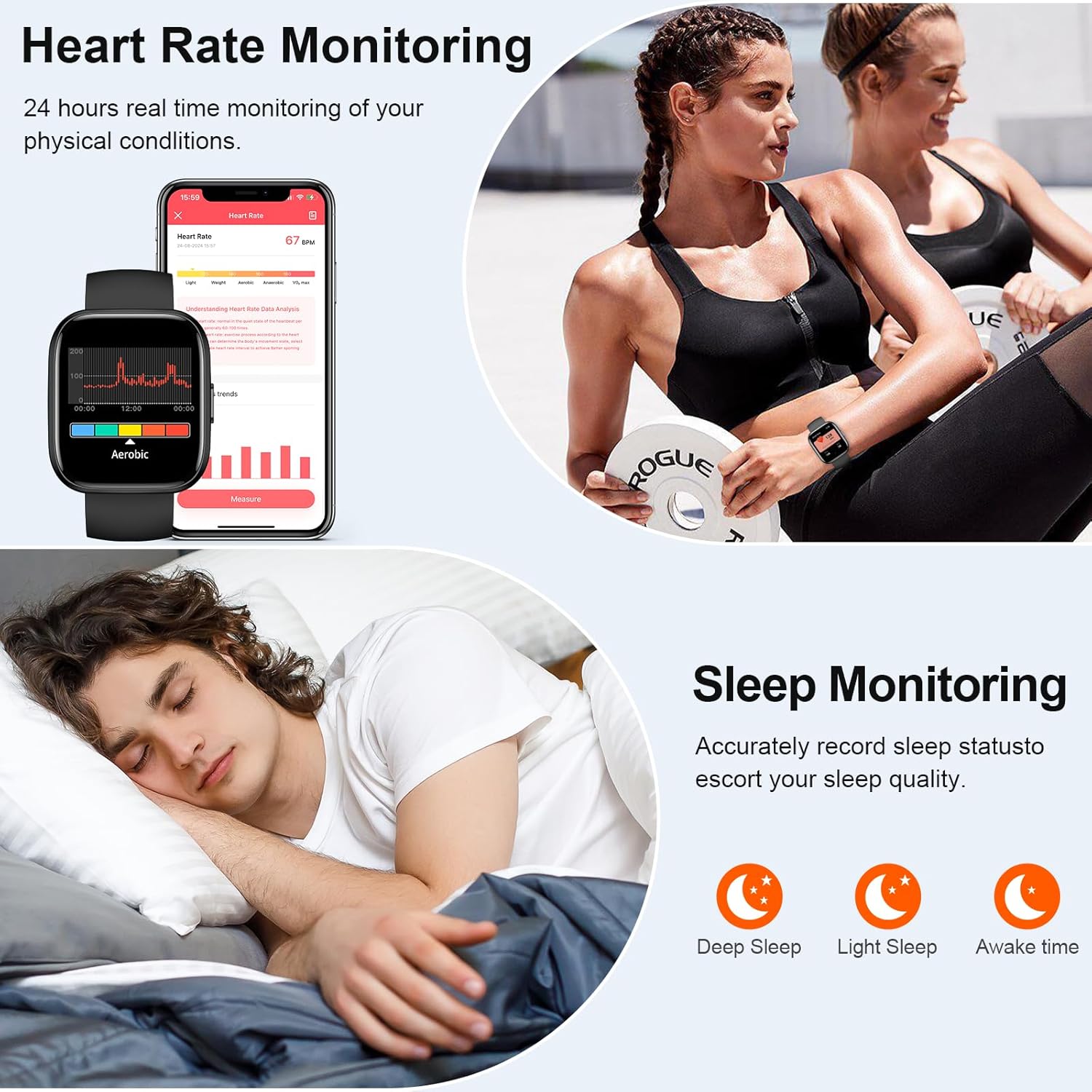 • Монитор за здраве в реално време и множество функции: смарт часовникът е оборудван с мощни сензори за движение и съдържа нова технология за измерване, която проследява сърдечната честота 24 часа в денонощието и състоянието на съня ви, което ви помага да правите разумни корекции в начина си на живот. Фитнес часовниците имат и много практични функции, като прогноза за времето, управление на музика, управление на камерата, напомняне за заседнал начин на живот, будилник, проследяване на женски цикли, намиране на телефон и др.