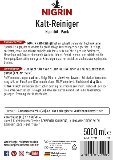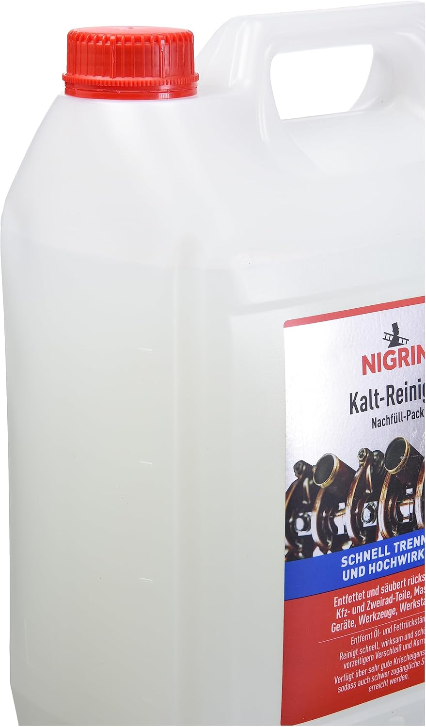 Студеният почистващ препарат NIGRIN е идеален за употреба върху вертикални повърхности на превозни средства, промишлени и селскостопански машини, дори велосипеди и градинска техника. Лесният за употреба специален почистващ препарат прави обезмасляването на двигателя изключително лесно. Бързодействащият студен почистващ препарат NIGRIN не само почиства, но и намалява износването на частите на двигателя, поддържа ги чисти и по този начин осигурява по-тиха работа за по-дълго време.