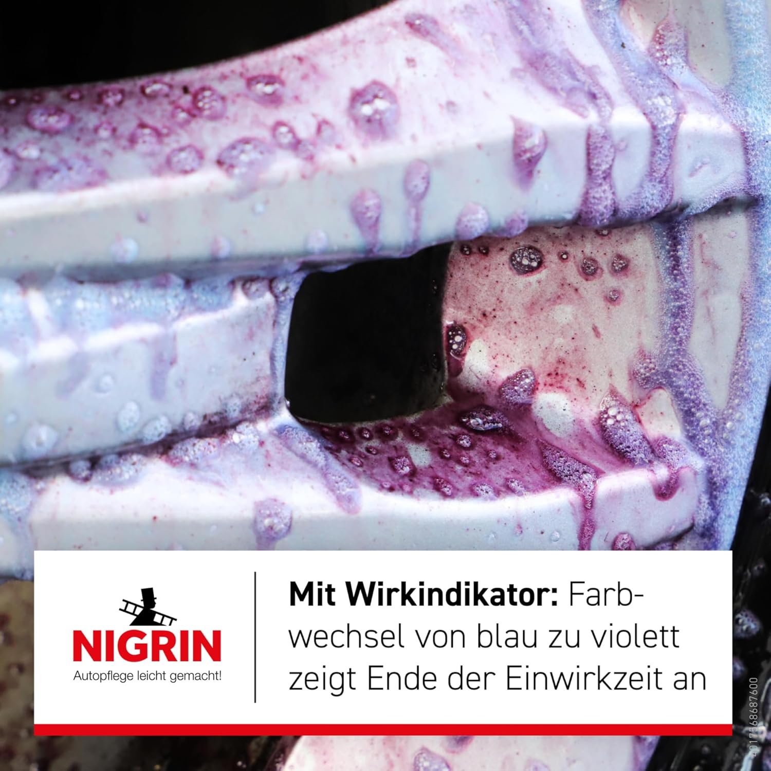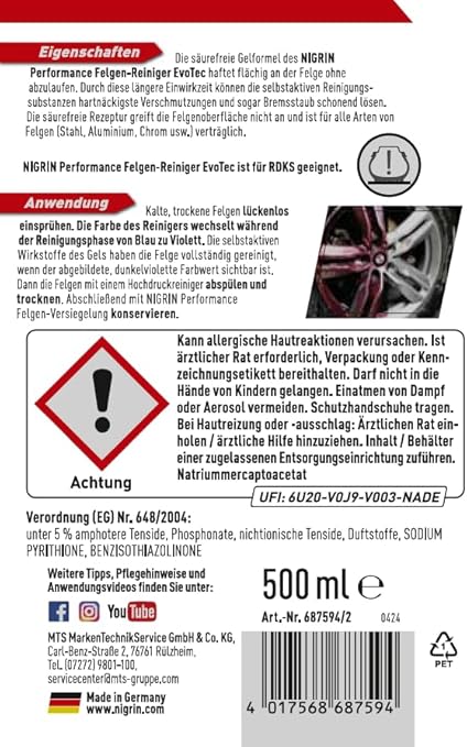 Препаратът за почистване на джанти NIGRIN EvoTec е самоактивен и високоефективно почиства всички видове джанти (стомана, алуминий, хром и др.). Препаратът за почистване на джанти NIGRIN EvoTec намалява до минимум усилията за поддръжка и работа. Той предлага тествана съвместимост с материалите: благодарение на специалната формула с неутрално pH за кожата, той не атакува повърхността на джантата и е подходящ за всички видове джанти (стомана, алуминий, хром и др.), което гарантира нов вид и стойност на вашите джанти.