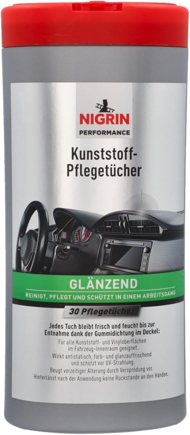Пластмасовите почистващи кърпи NIGRIN Performance позволяват бърза и лесна грижа за интериора на автомобила, както в движение, така и междувременно. Те почистват, подхранват и защитават с една стъпка, освежават цвета и придават нов блясък. Пластмасовите почистващи кърпи NIGRIN performance осигуряват нов вид на интериора на автомобила и по този начин допринасят за стойността на вашия автомобил. Кърпите, изработени от висококачествен памук, са особено устойчиви на разкъсване и издръжливи. Опаковката „fresh pack“ поддържа кърпичките в кутията влажни и свежи до края. Изваждането е особено лесно, а вече извадените кърпи са защитени от изсъхване в резервоара под капака. Инструкции за употреба: Преди първото изваждане, махнете капака, разкъсайте опаковката „fresh pack“ отгоре и я поставете обратно в кутията. Издърпайте първата кърпа от центъра на ролката и я прокарайте през отвора за изваждане на капака. Поставете капака обратно. Извадете кърпата и изтъркайте замърсените повърхности. Ако от опаковката „fresh pack“ се извадят твърде много кърпи, те могат да се съхраняват в резервоара. Капакът „flip-top“ се държи здраво и предотвратява изсъхването - винаги затваряйте капака, докато щракне на мястото си.