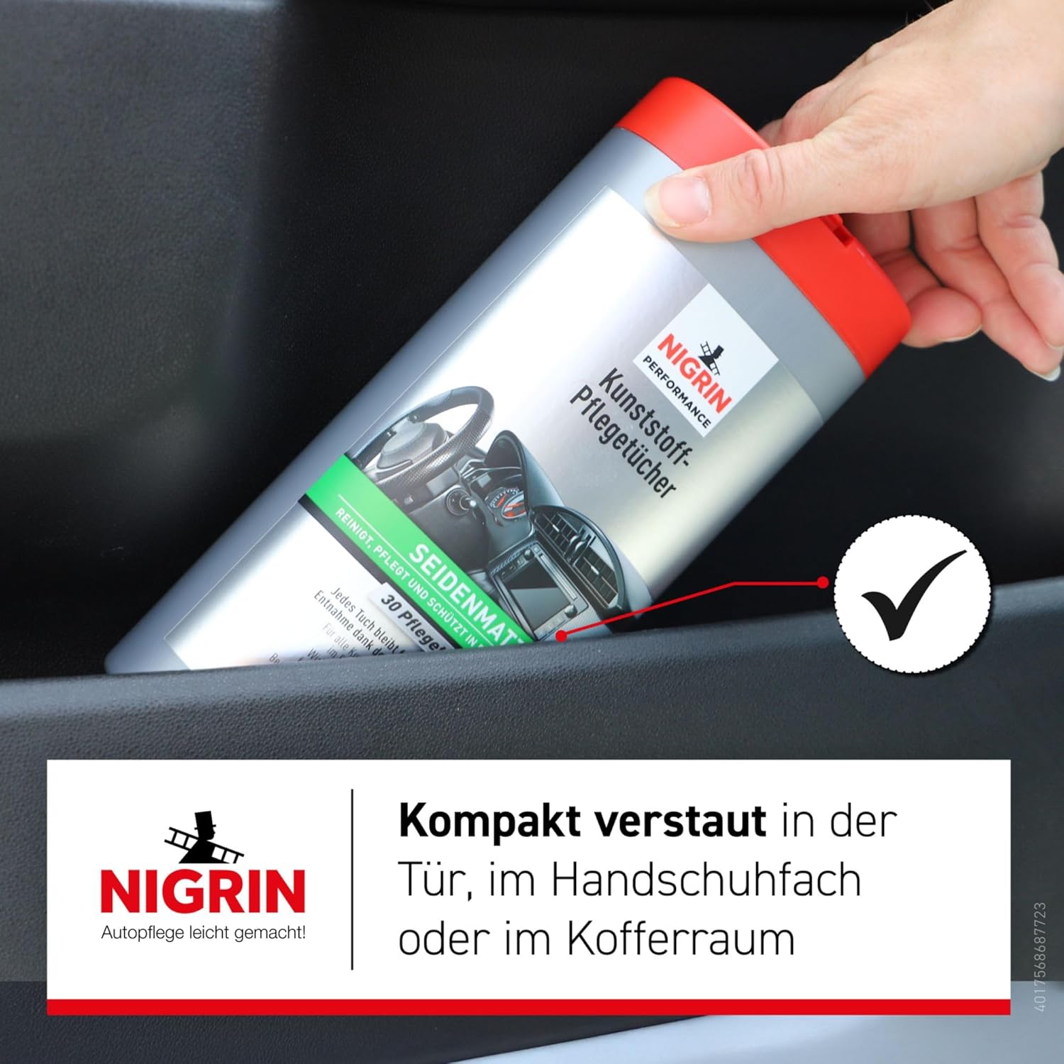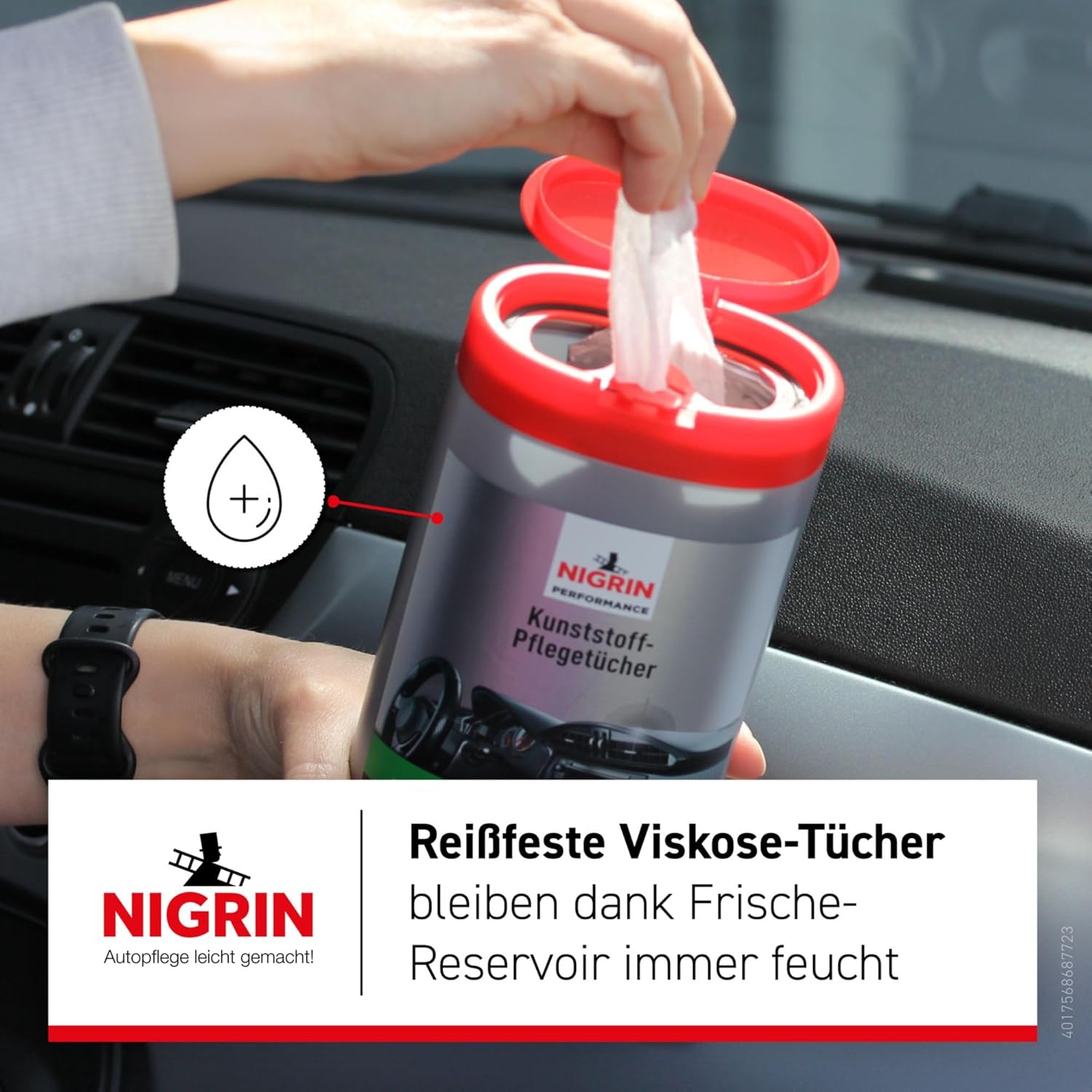 Пластмасовите почистващи кърпи NIGRIN Performance позволяват бърза и лесна грижа за интериора на автомобила, както в движение, така и междувременно. Те почистват, подхранват и защитават с една стъпка, освежават цвета и придават нов блясък. Пластмасовите почистващи кърпи NIGRIN performance осигуряват нов вид на интериора на автомобила и по този начин допринасят за стойността на вашия автомобил. Кърпите, изработени от висококачествен памук, са особено устойчиви на разкъсване и издръжливи. Опаковката „fresh pack“ поддържа кърпичките в кутията влажни и свежи до края. Изваждането е особено лесно, а вече извадените кърпи са защитени от изсъхване в резервоара под капака. Инструкции за употреба: Преди първото изваждане, махнете капака, разкъсайте опаковката „fresh pack“ отгоре и я поставете обратно в кутията. Издърпайте първата кърпа от центъра на ролката и я прокарайте през отвора за изваждане на капака. Поставете капака обратно. Извадете кърпата и изтъркайте замърсените повърхности. Ако от опаковката „fresh pack“ се извадят твърде много кърпи, те могат да се съхраняват в резервоара. Капакът „flip-top“ се държи здраво и предотвратява изсъхването - винаги затваряйте капака, докато щракне на мястото си.