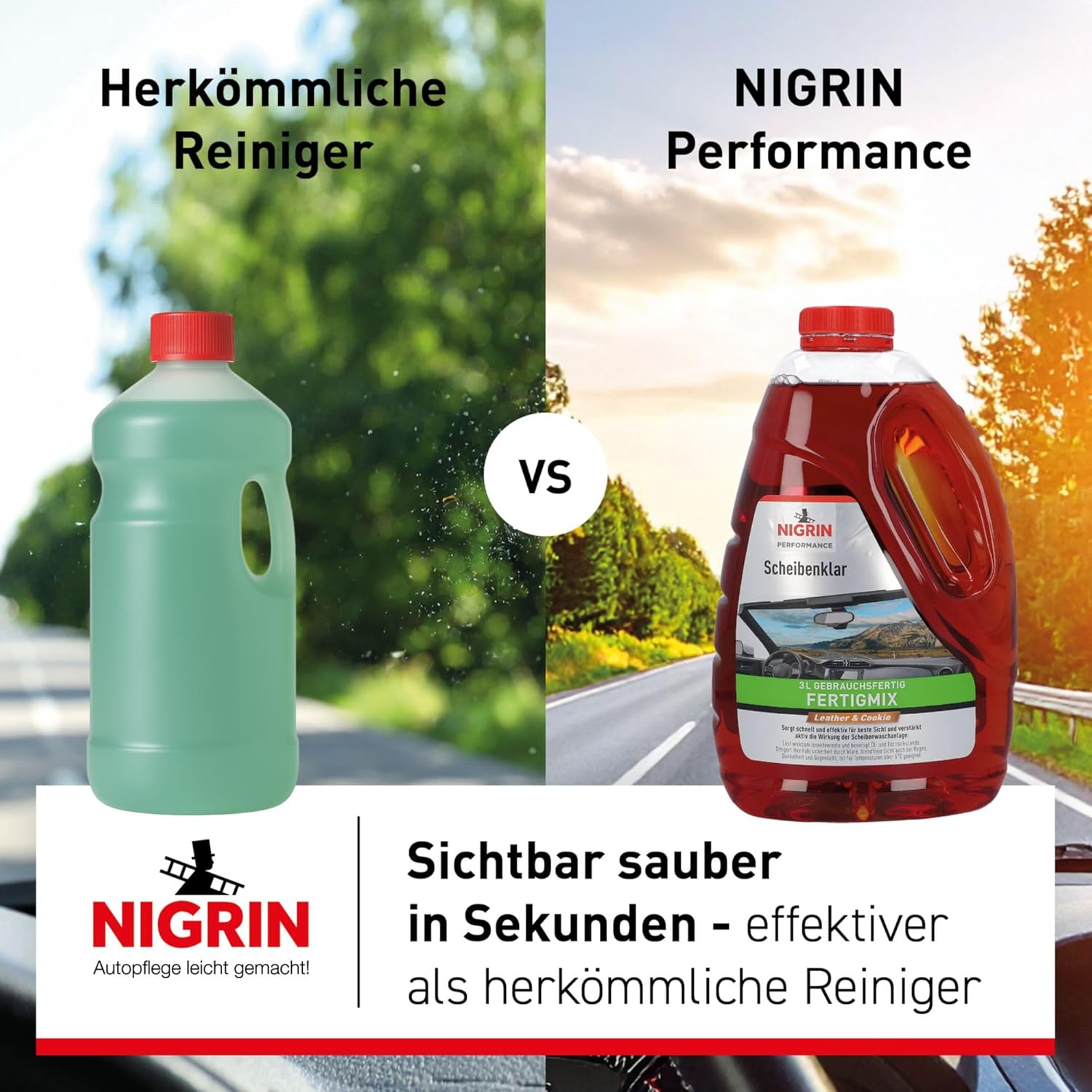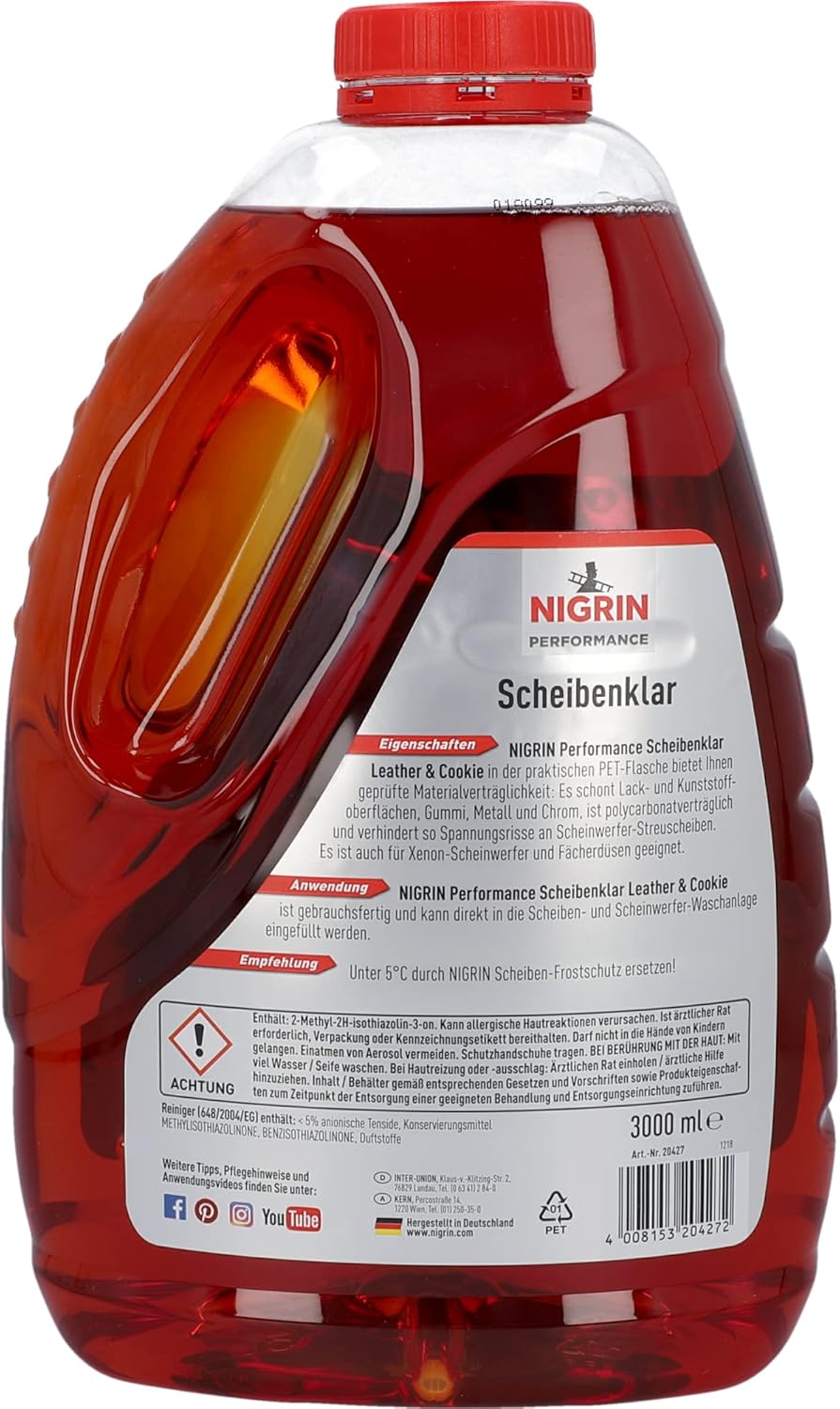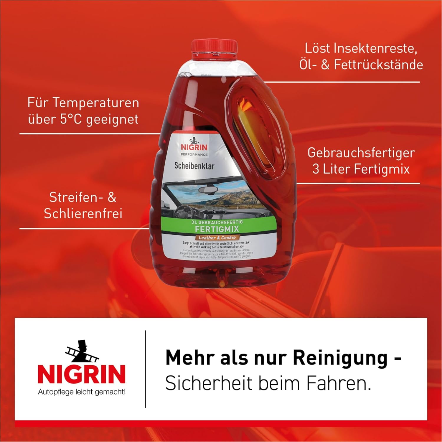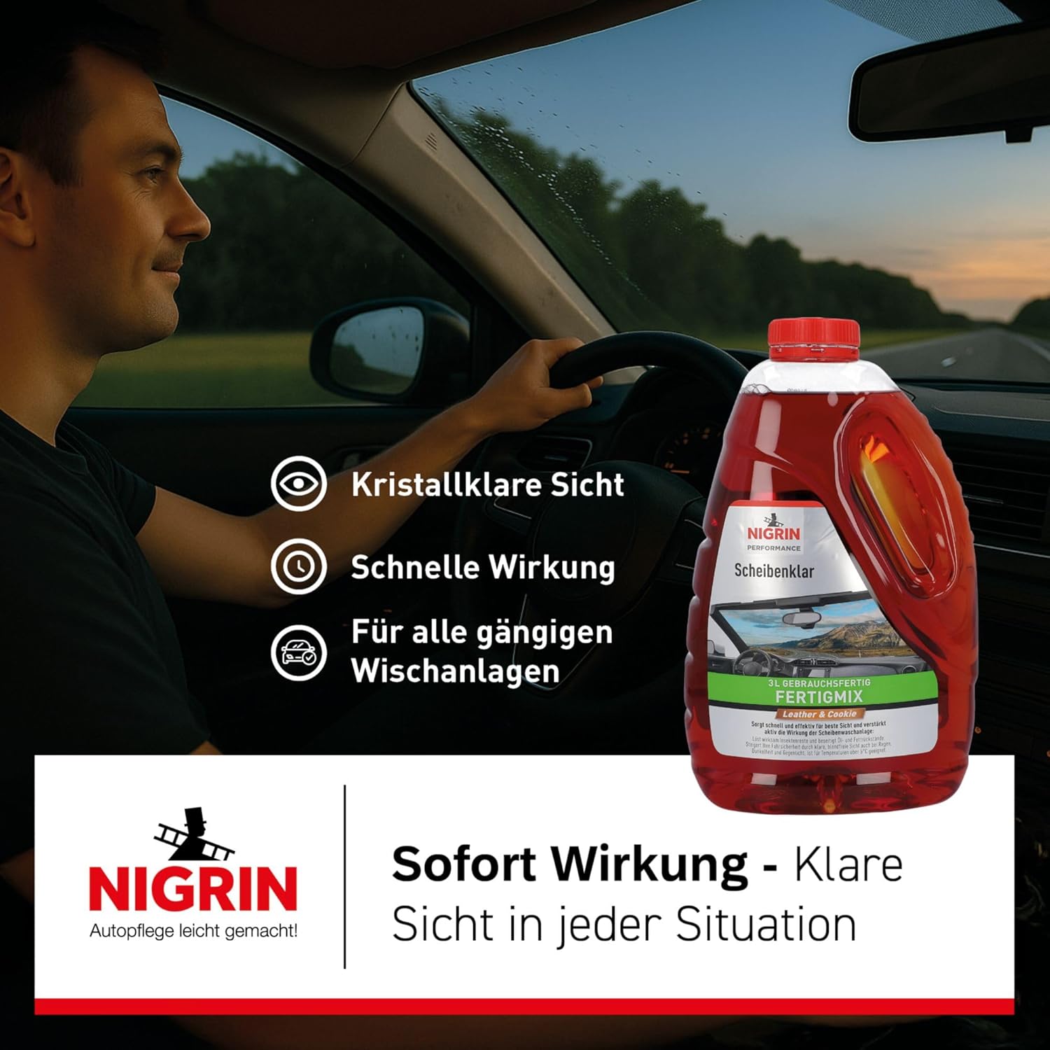 Всесезонният Nigrin Scheibenklar е специално разработен за променливи метеорологични условия през пролетта и есента. Това означава, че може да се използва както преди, така и след прилагането на Nigrin за защита от замръзване на предното стъкло в системата за измиване на предното стъкло. Nigrin Scheibenenklar всесезонният осигурява безопасност и ясна видимост благодарение на уникалната корекция на повърхностноактивните вещества плюс антифриз за предното стъкло. Предимствата на Nigrin Scheibenklar всесезонния: