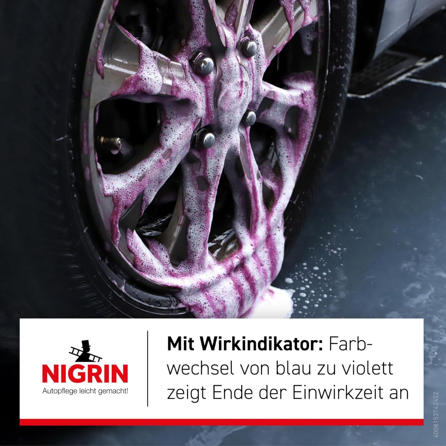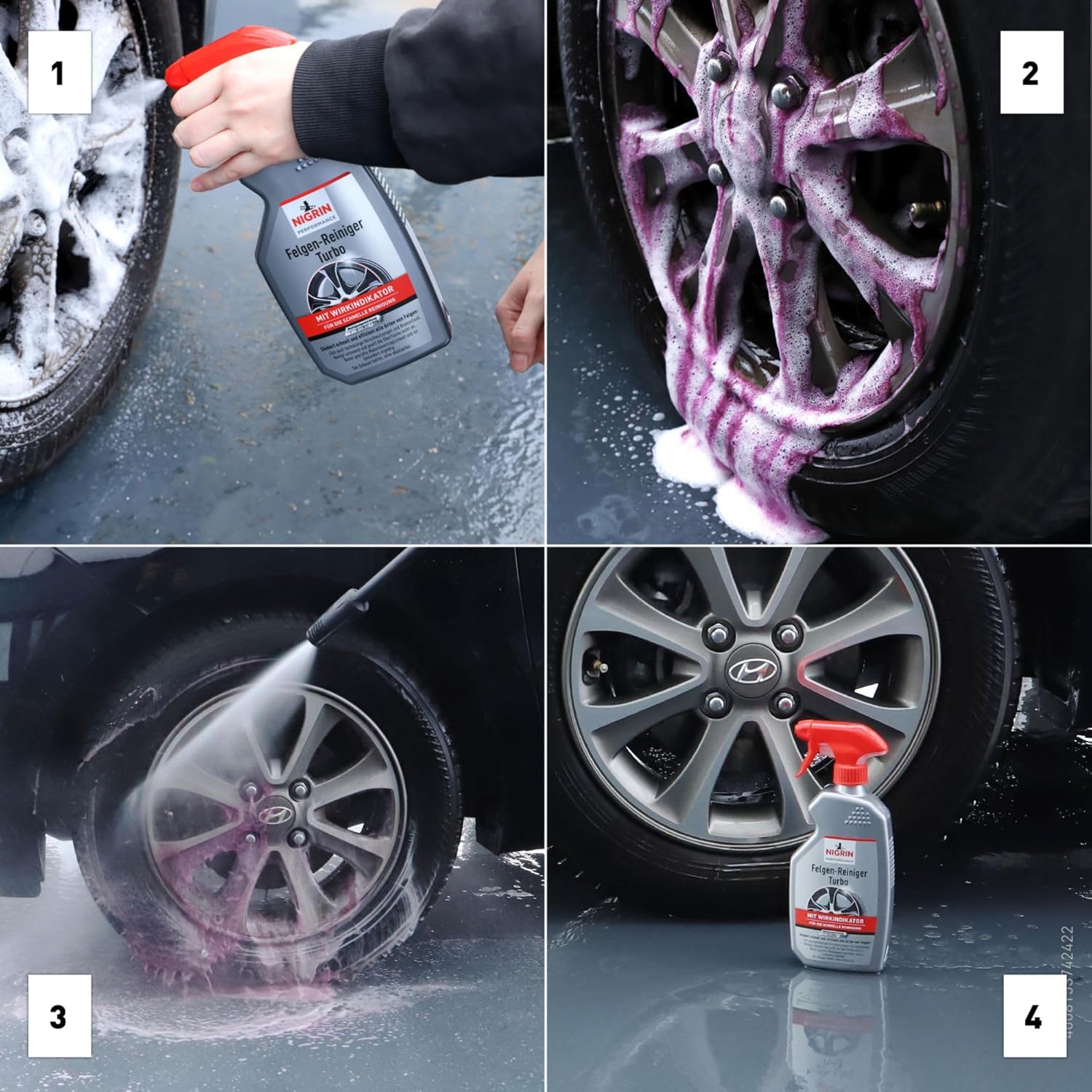 • Индикатор за ефект: препаратът за почистване на джанти се обезцветява след нанасяне, когато е свършил работата си, няма нужда от повторна обработка