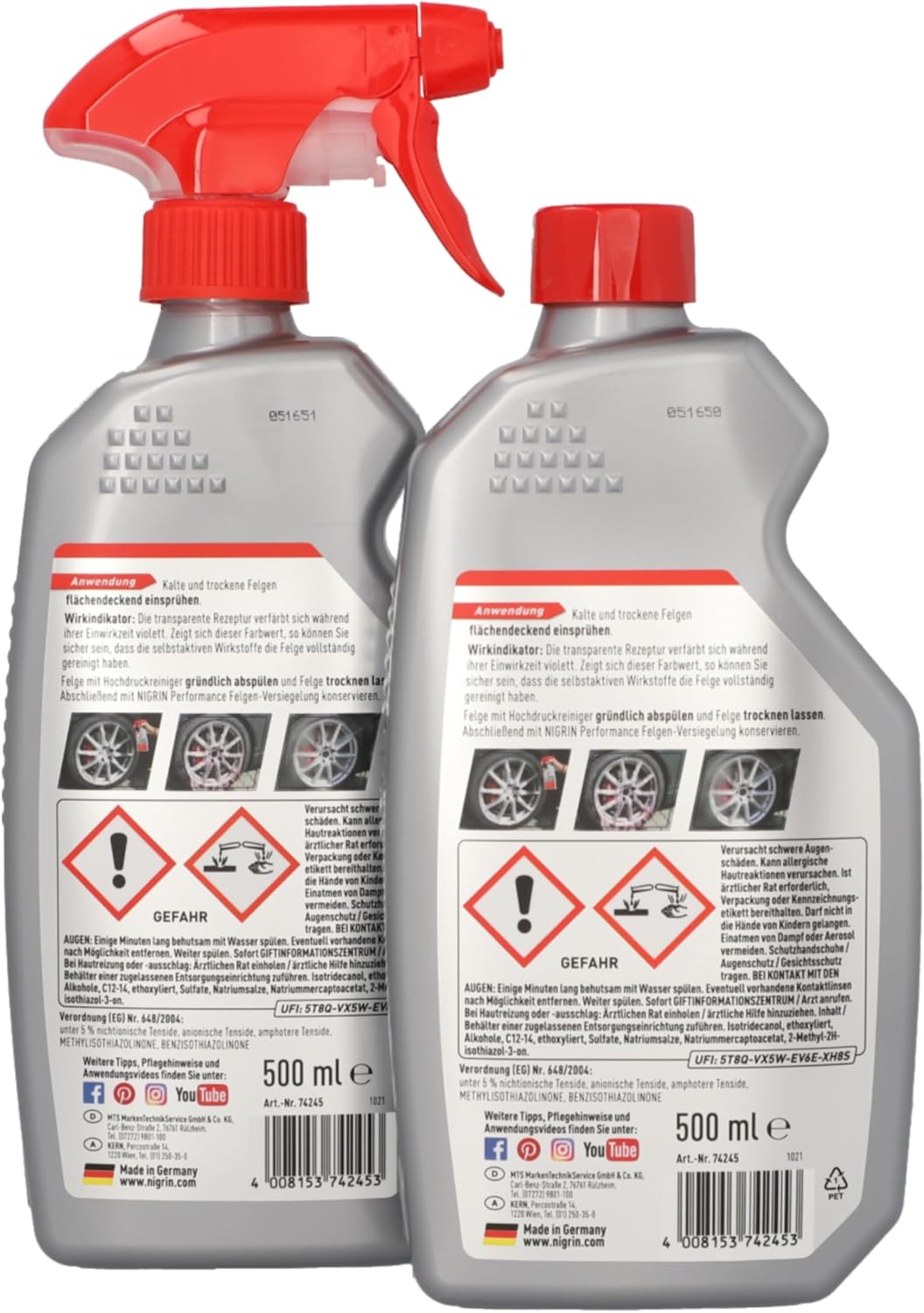 Nigrin Turbo 74245 Почистващ препарат за джанти за гуми, опаковка от 2 x 500 мл