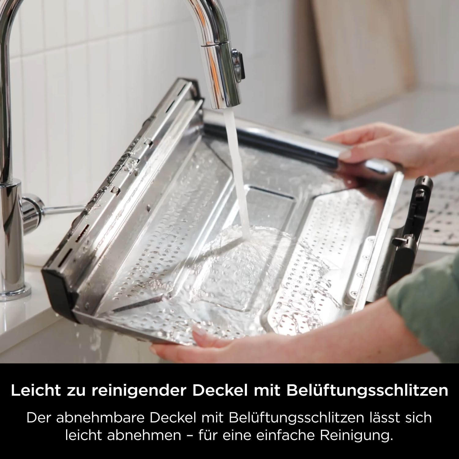 • ЛЕСНО ПОЧИСТВАНЕ: Подвижните котлони са с незалепващо покритие за лесно почистване, с контейнер за събиране на мазнини за готвене без пръски. Подвижният мрежест капак е подходящ за съдомиялна машина.