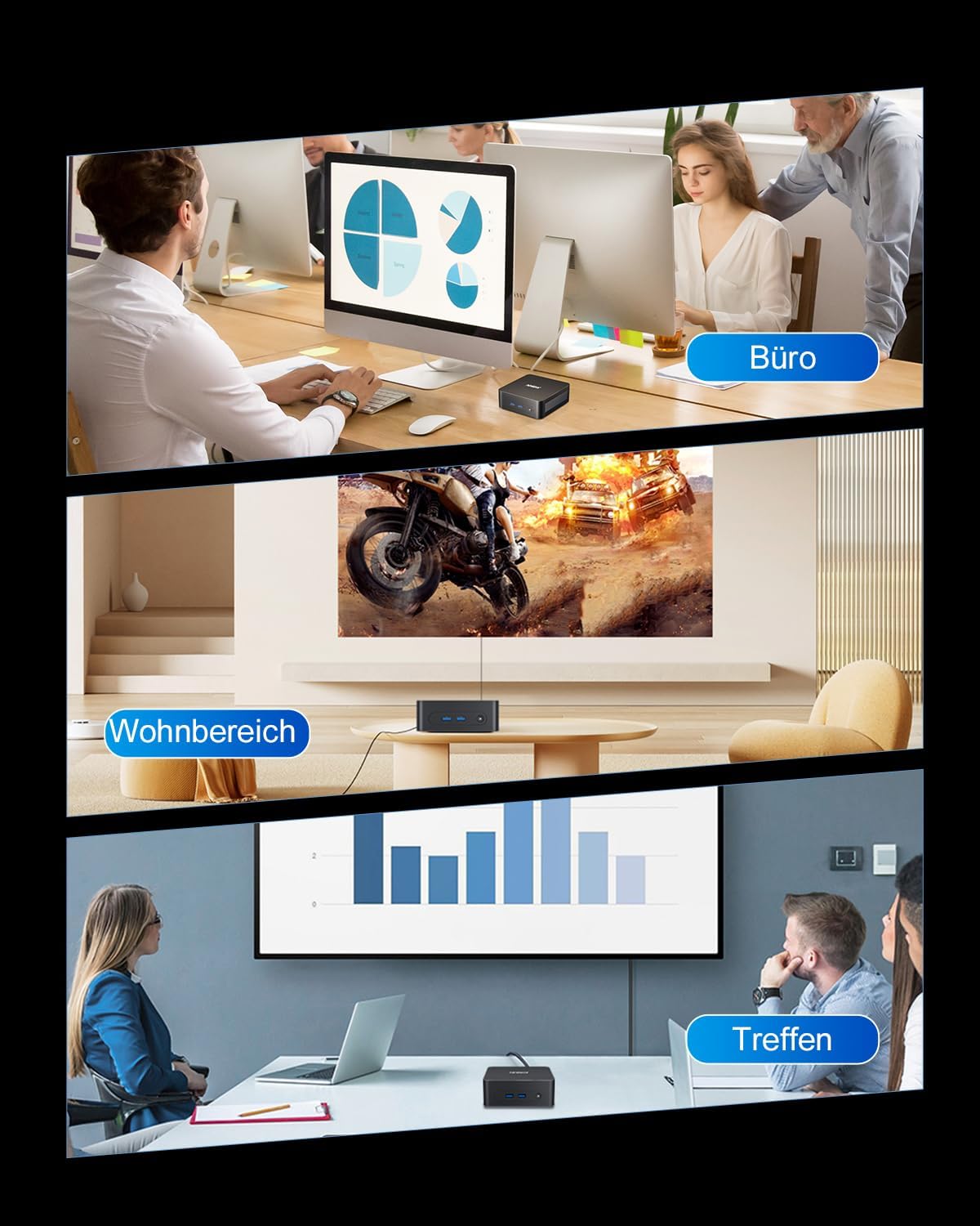 • Компактен размер, лесен за носене: Нашият микро компютър е с размери само 9,9 x 9,9 x 3,3 см и тежи само 248 г. Подходящ е за поставяне на бюро, където пространството е ограничено, или за окачване зад монитора или на стената, спестявайки много място. Компактният му размер го прави лесен за носене и може да бъде свързан към монитор или проектор по всяко време и навсякъде, което го прави идеален за работа в офис, срещи, пътуване, употреба на открито и др.