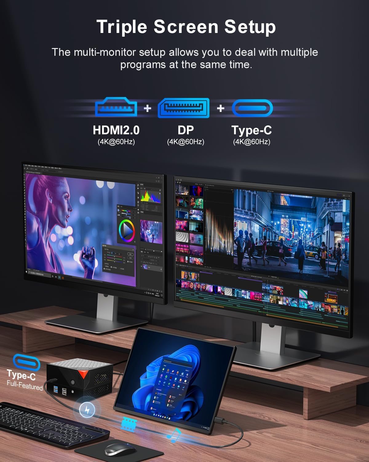 • Двоен дисплей и специален USB-C порт: Мини компютърът N100 разполага с два HDMI 2.0 порта, поддържащи 4K@60Hz Ultra HD качество на изображението, предлагайки ви Ultra HD визуално изживяване с перфектна яснота на пикселите. В сравнение с други мини компютри, той има и повече USB-C интерфейси (само за пренос на данни), което позволява всички видове пренос на данни от мобилни телефони и таблети, което го прави идеален за работа, учене, домашно визуално забавление и други.