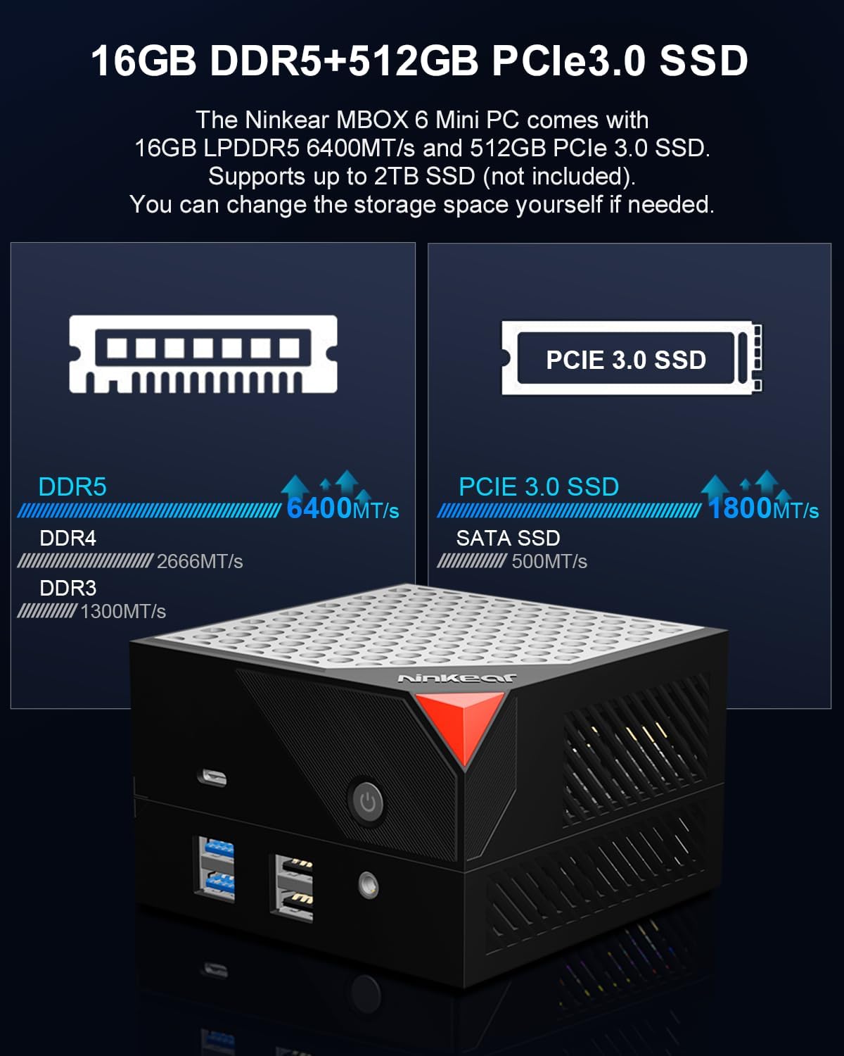 • Изключително голяма RAM памет и SSD: Нашите мини компютри са оборудвани с 16GB DDR4 RAM, което ви позволява да стартирате множество приложения, като игри, уебсайтове и PS4, без забавяне. Специализираният 512GB M.2 SSD гарантира, че можете да зареждате разнообразни файлове и игри бързо, като драстично намалява времето за изчакване за прехвърляне на файлове (системата Win11 е предварително инсталирана и готова за употреба). Поддържа резервни M.2 NVMe PCIe3.0 M.2 SATA SSD дискове до 2TB.