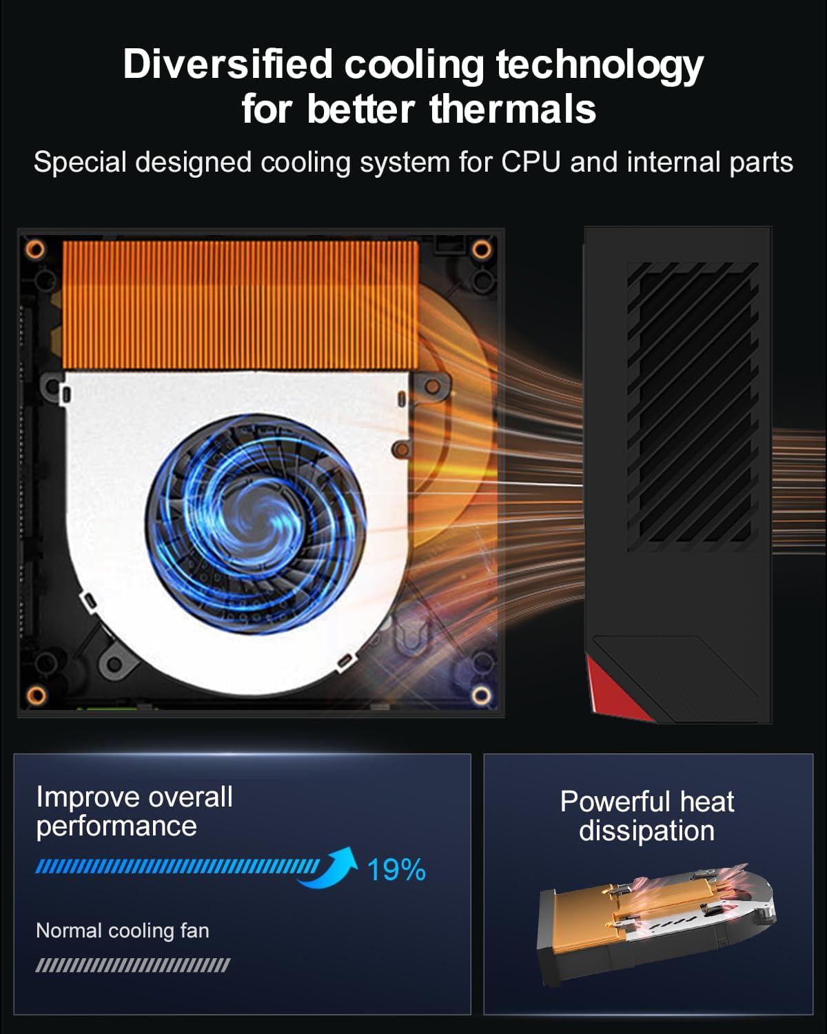 • Енергоспестяване и ниска консумация на енергия: В сравнение с традиционните настолни компютри, мини компютърът консумира по-малко енергия (само 6W) и генерира по-малко топлина, което го прави по-енергийно ефективен и екологичен. Продуктът е тих, изключително стабилен и работи почти безшумно, което го прави идеален за употреба в библиотеки, офиси, спални и други помещения, без да безпокои околните.