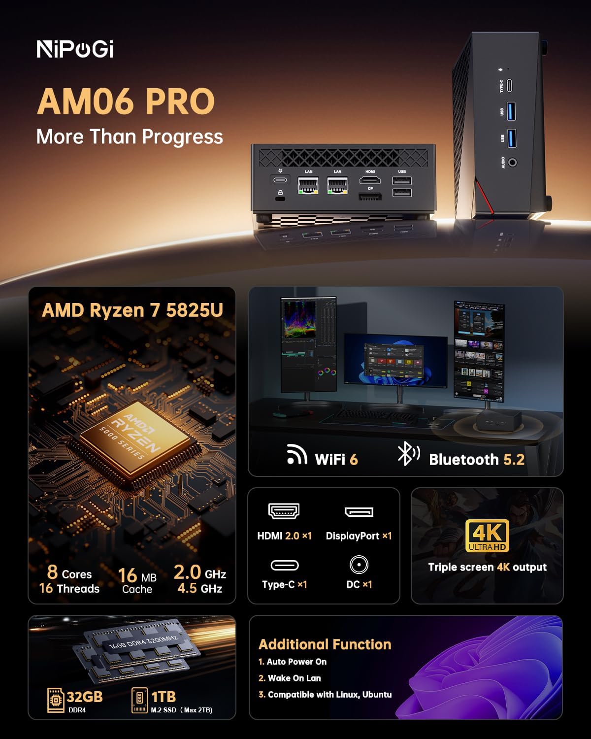 NiPoGi AM06 PRO Мини компютър 32GB DDR4 1024GB M.2 SSD, AMD Ryzen 7 5825U (8C/16T, до 4.5GHz) Мини настолен компютър W-11 Pro, WiFi 6, Dual LAN, 4K Triple Display, микро компютър с VESA за училище/офис/HTPC