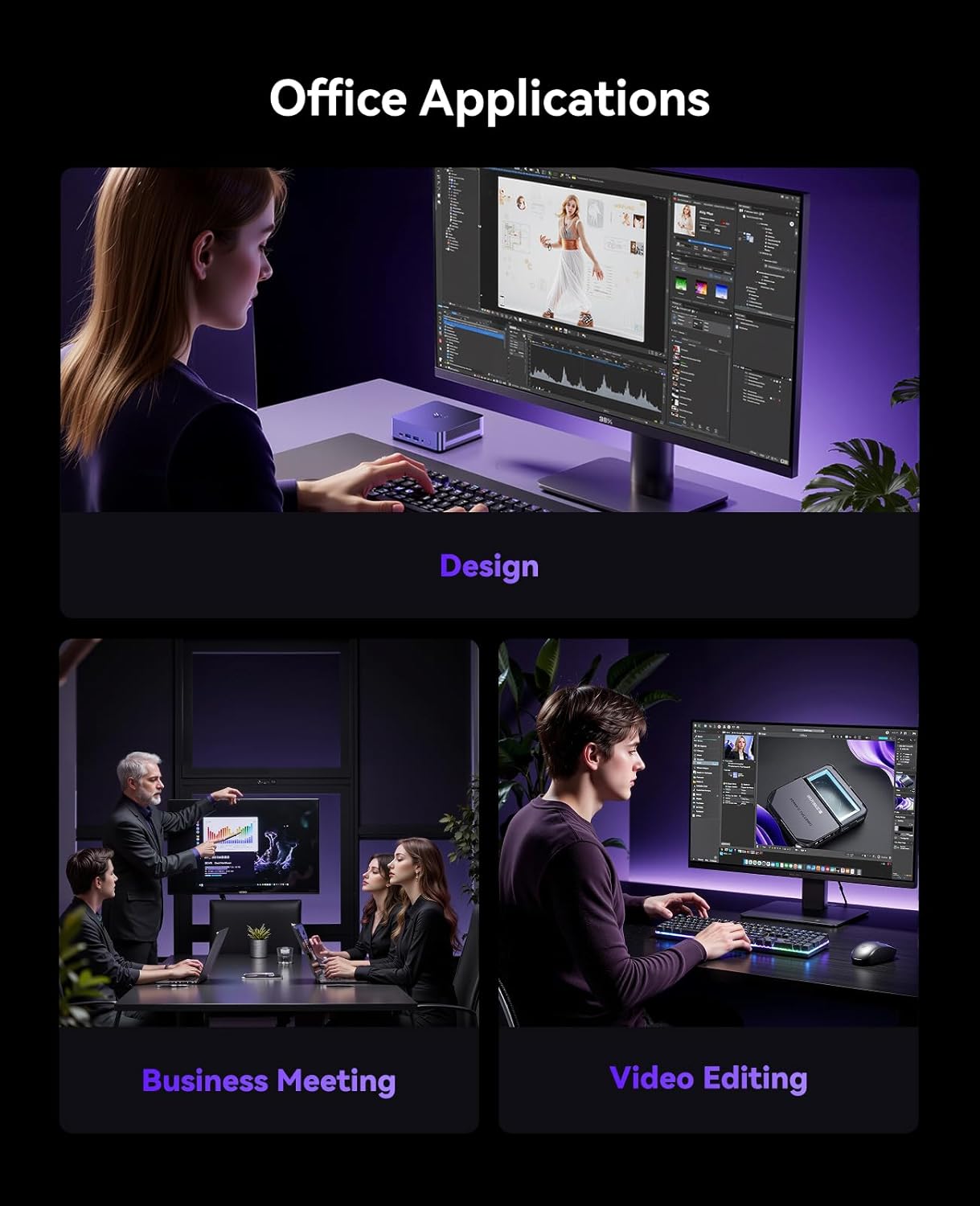 • Поддържа 4K дисплей на четири екрана (HDMI 2.1, DP 1.4 и USB 4), което позволява едновременно свързване на четири монитора за повишаване на ефективността на работа или създаване на завладяващо развлекателно изживяване. USB 4 портът (40Gbps) поддържа външни графични карти или устройства за съхранение с високи скорости на трансфер. Независимо дали става въпрос за редактиране на видео или за игри на няколко екрана, този мини компютър предлага гъвкаво решение за дисплей.