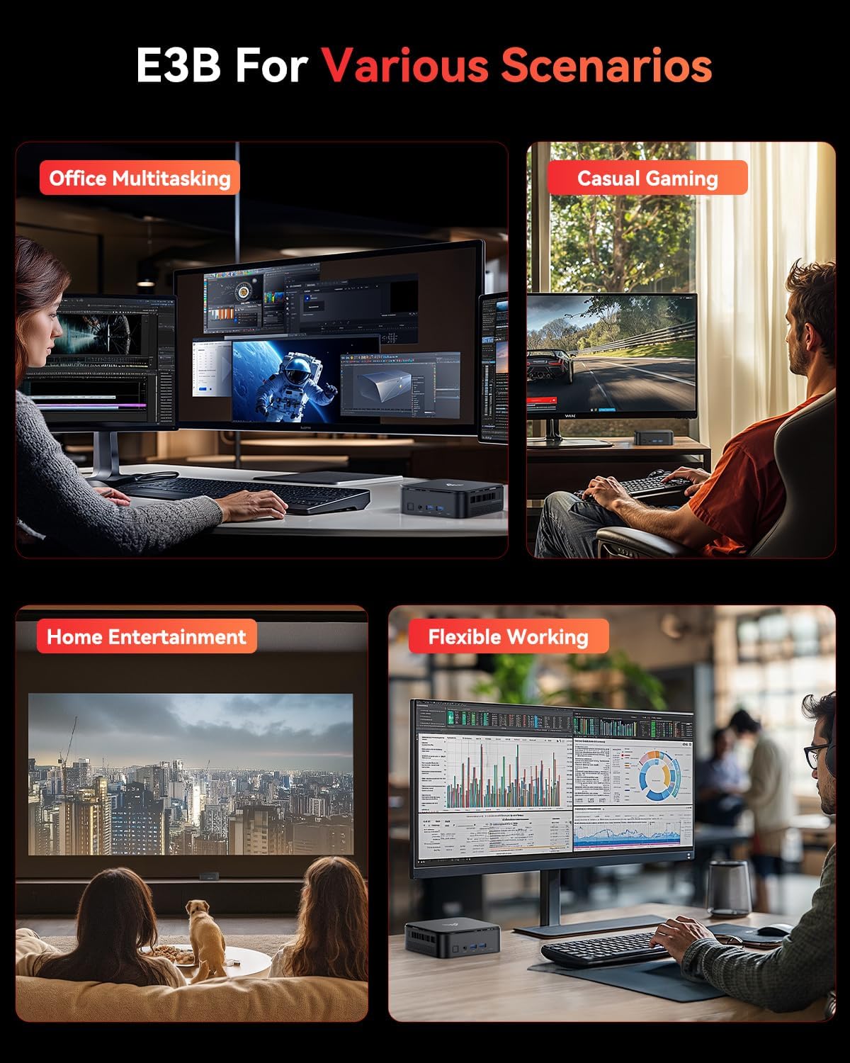 • ✅【Двуканално DIY разширение на паметта】Мини компютърът E3B разполага с вградени 16GB RAM, а двата слота за карти могат да бъдат разширени до 64GB (32GB*2), което предлага бързо четене/запис на данни и възможности за съхранение. В комбинация с 512GB M.2 SSD, той може да бъде разширен до 4TB (2TB*2). Изключително гъвкавата разширяема игра може да отговори на разнообразните нужди от памет на различни групи хора. Капацитетът за съхранение на мини компютъра може да издържи на изпитанието на големи файлове с данни, както и на изтегляне на видеоклипове и игри.