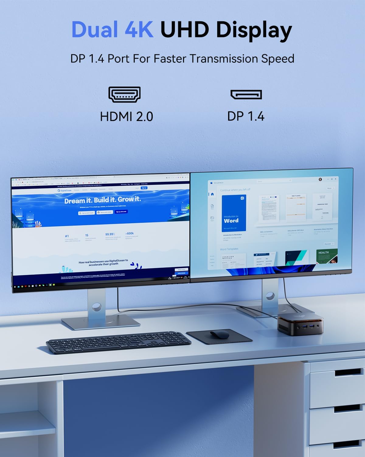 • 【16GB DDR4 и 256GB SSD】Мини компютърът е оборудван с 16GB DDR4 за по-бърза многозадачност и плавно превключване между приложения. 256GB M.2 SSD осигурява бързо време за зареждане, бърз трансфер на файлове и много място за съхранение, елиминирайки бавното зареждане и осигурявайки бърза реакция. Пространството за съхранение може да бъде разширено до 2TB (не е включено) с помощта на M.2 NVMe/SATA слота, което улеснява съхранението на файлове.