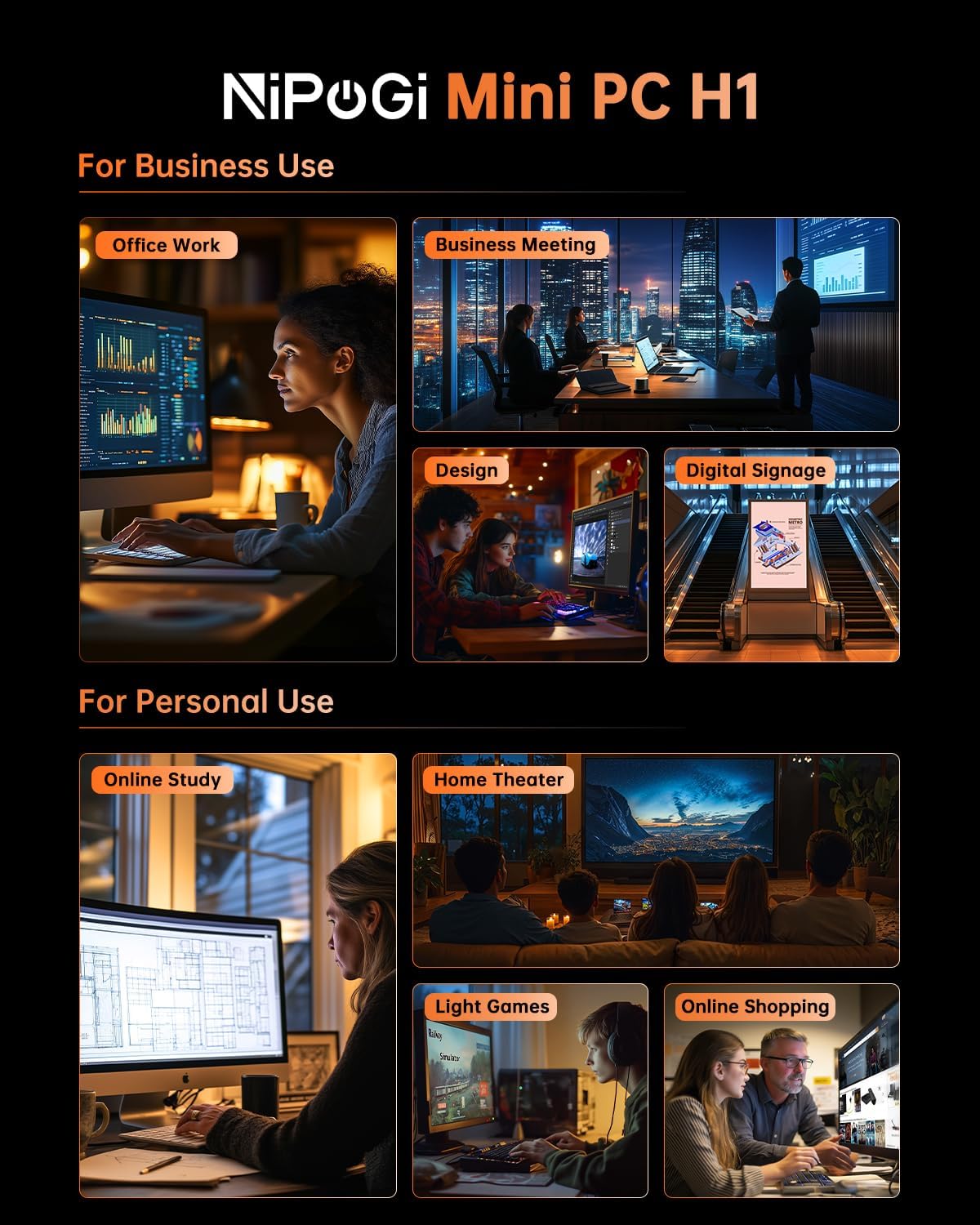 • Компактен дизайн, надеждно обслужване: С размери само 12,9 x 12,9 x 5,1 см, NiPoGi H1 разполага с VESA монтаж, което го прави лесен за инсталиране на гърба на монитор или на бюро, осигурявайки ви подредена офис среда. NiPoGi е посветен на проучването и популяризирането на мини компютри от десет години. Ние предлагаме 24/7 обслужване на клиенти и доживотна техническа поддръжка. Ако имате някакви въпроси, не се колебайте да се свържете с нас.