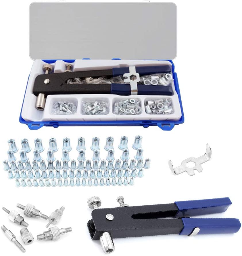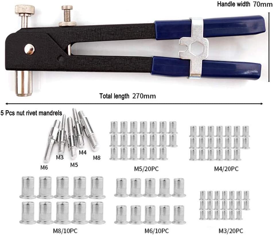 • Дорник за нитове: M3 / M4 / M5 / M6 / M8 Общо 80 броя оребрени нит гайки, M3 (20 броя), M4 (20 броя), M5 (20 броя), M6 (10 броя), M8 (10 парчета), за да отговори на вашите различни нужди.
