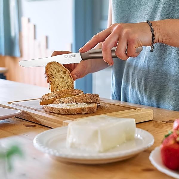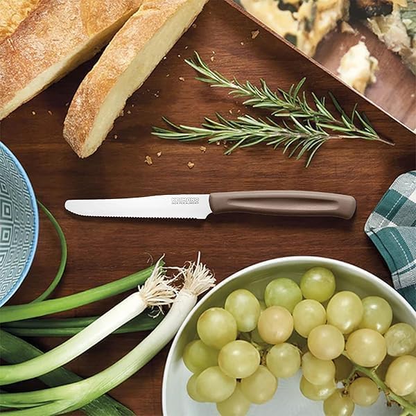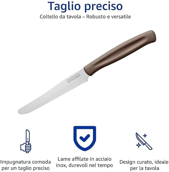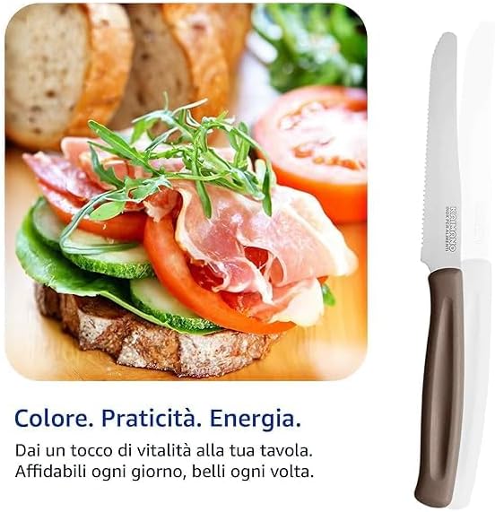Перфектно проектирани ножове, елегантни и модерни. Те внасят радост и цвят на масата. Дръжка от полипропилен, формована чрез шприцване. Закалени и полирани остриета от неръждаема стомана.