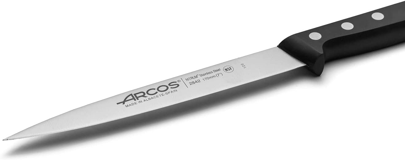 • ПРЕЦИЗНОСТ И ИЗДРЪЖЛИВОСТ: Този рибен нож е произведен с помощта на патентованата технология Nitrum на Arcos, която осигурява по-голяма издръжливост, твърдост и прецизно рязане. Създаден е чрез оформяне на неръждаема стомана с азот, за да се получи високопроизводителен и изключително устойчив инструмент.