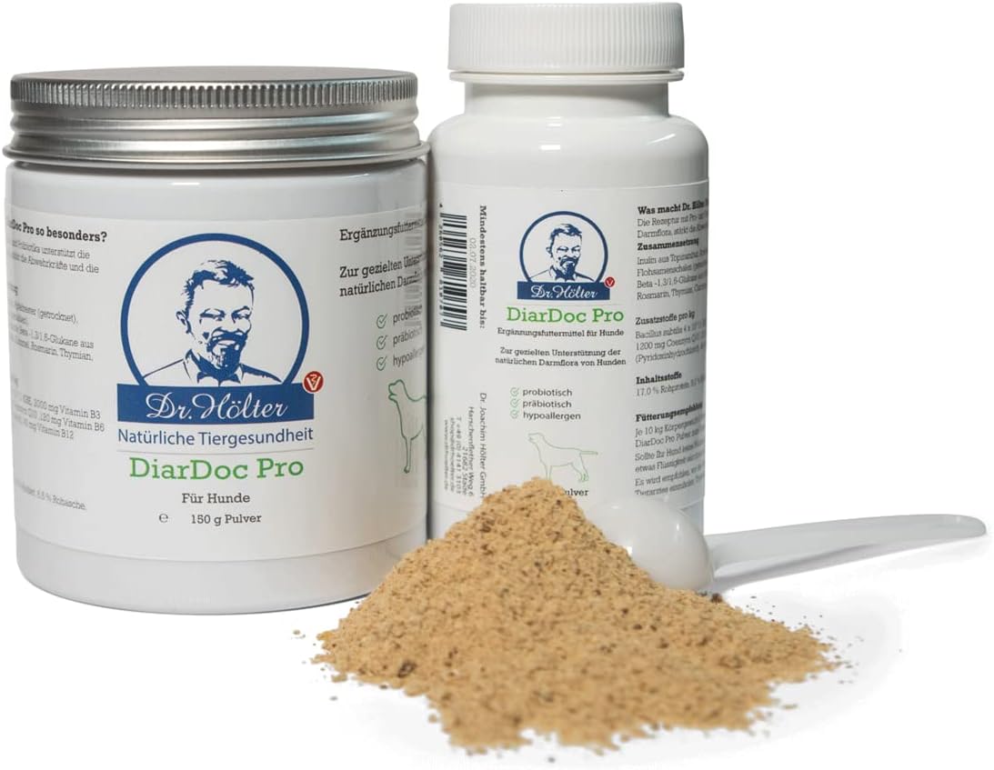 Hinweis: Reagiert Ihr Hund sehr sensibel auf Veränderungen seiner Fütterung, oder leidet er unter starken Verdauungsproblemen, beginnen Sie bitte mit der halben DiarDoc Pro Dosierung und erhöhen sie erst nach einigen Tagen auf die volle Menge. Dies gibt dem Aufbau der Darmflora Gelegenheit, sich an die im DiarDoc Pro enthaltenen Präbiotika zu gewöhnen und vermeidet umstellungsbedingte Blähungen. Bei akutem Durchfall empfehlen wir DiarDoc Akut.