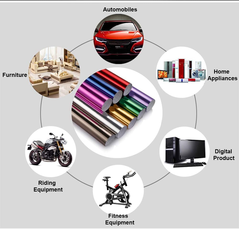 Новото хромирано огледално винилово фолио може да се използва за: преден капак, задна врата, спойлер, устни, странични решетки, странични огледала, предно стъкло, интериорна облицовка, калници, дръжки на врати, джанти, ауспуси, табло, волан, вътрешни дръжки на врати, жабки, контролен панел на автомобила и др. Други приложения: като мобилен телефон, капак на лаптоп, компютърни китари/барабани, високоговорители, портфейли, калъфи за албуми, очила, клипборд, спортна екипировка, принтер, DVD плейър, както и мебели за дома.