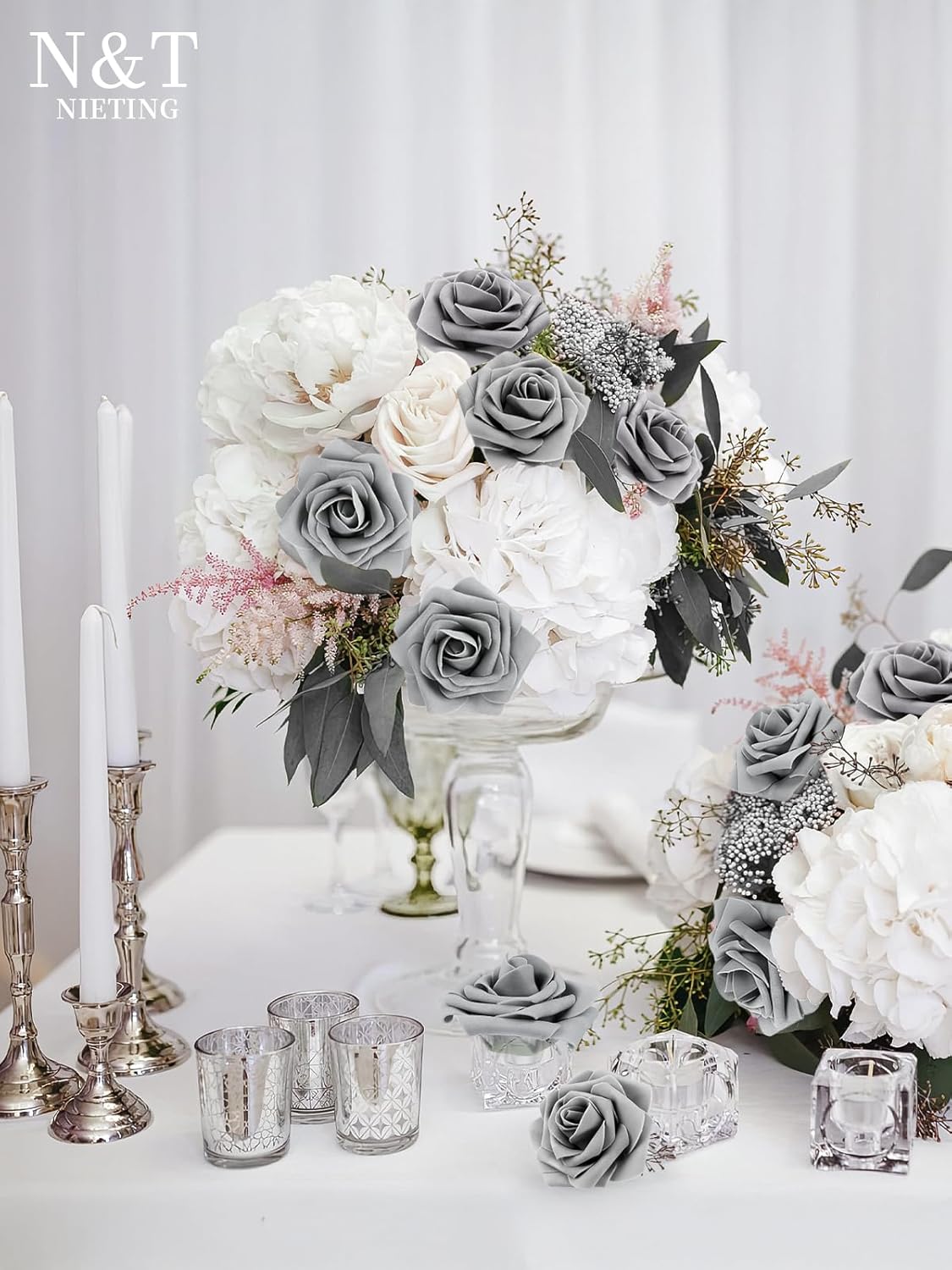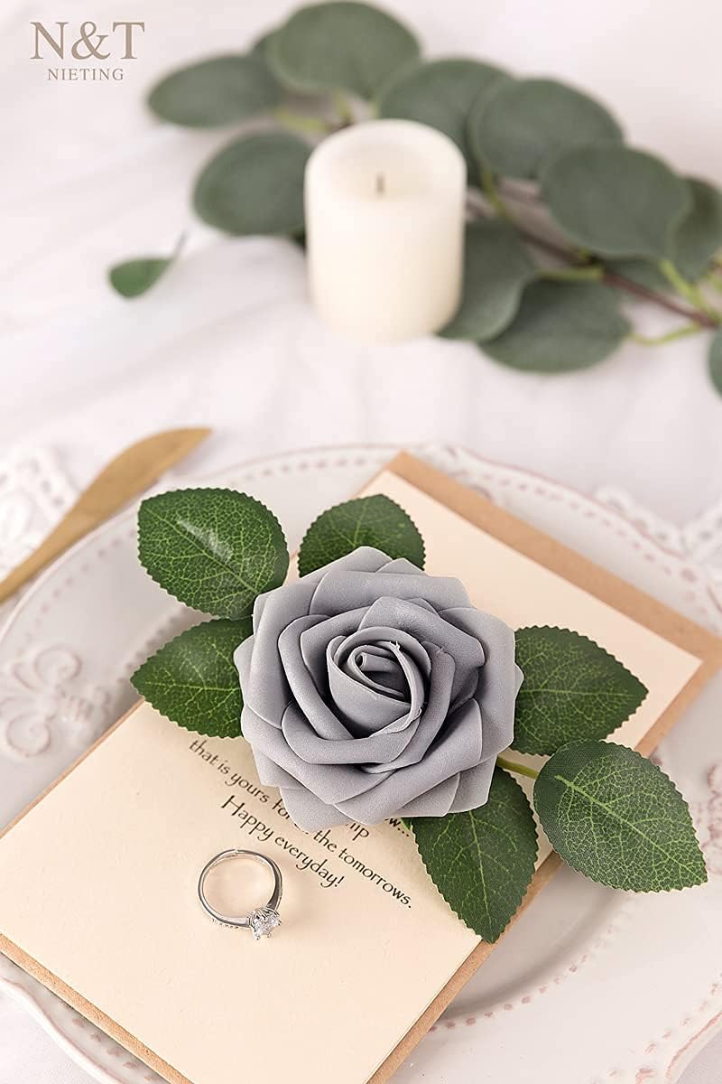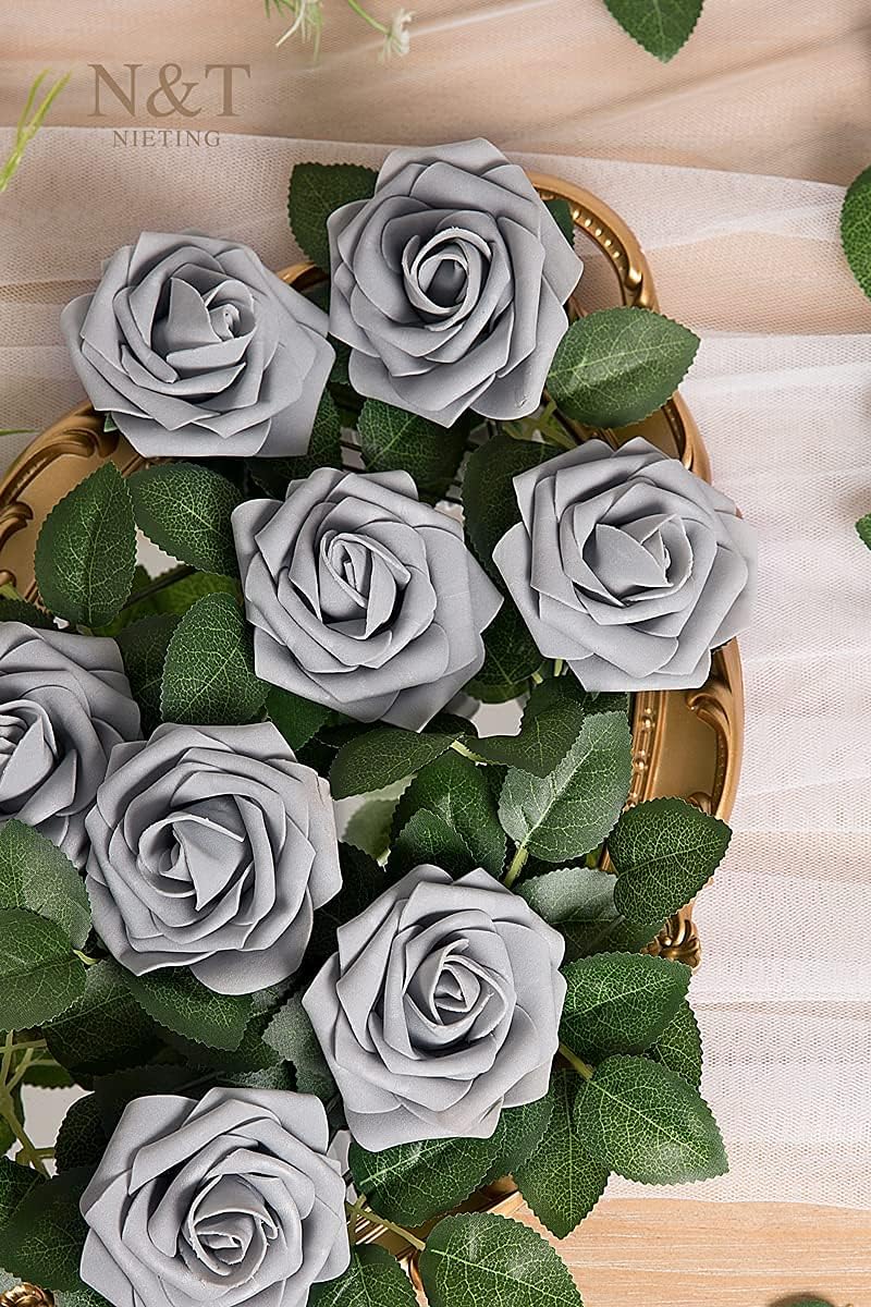 N&T NIETING Изкуствени рози от пяна със стъбла за „Направи си сам“ сватбени букети, булчински букети, декорация за дома, сиви, 25 броя