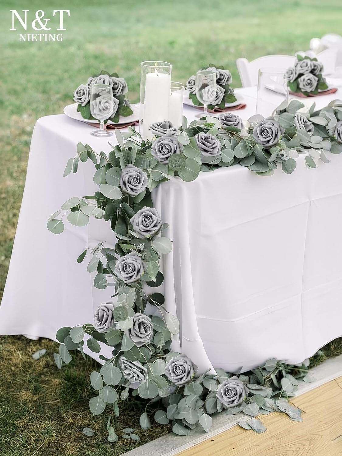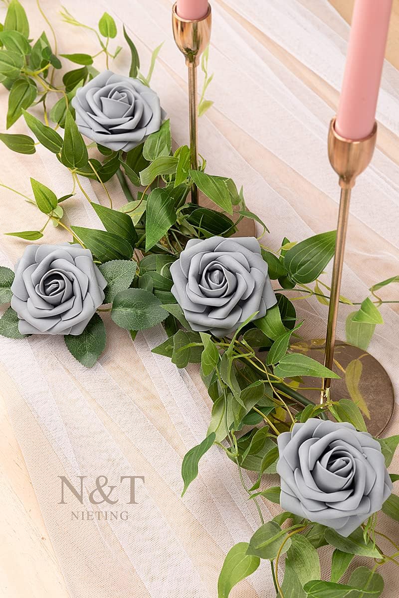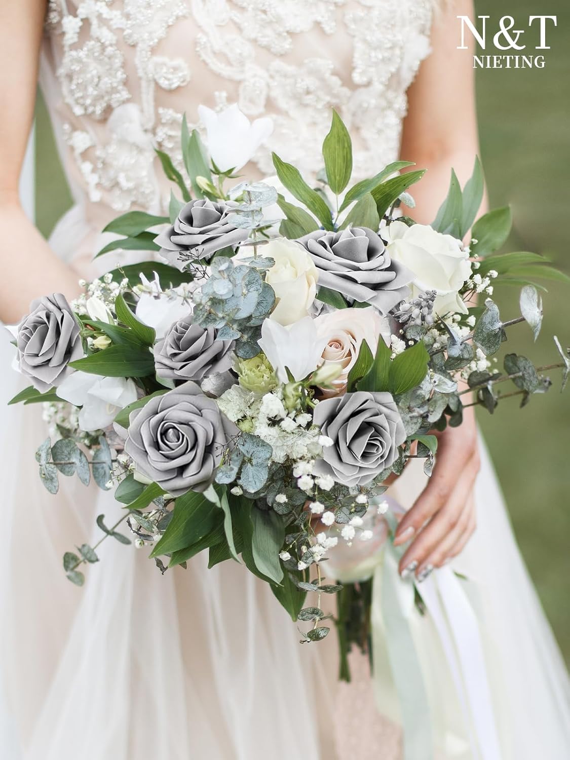 N&T NIETING Изкуствени рози от пяна със стъбла за „Направи си сам“ сватбени букети, булчински букети, декорация за дома, сиви, 25 броя