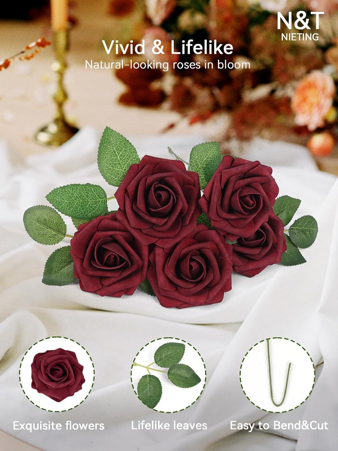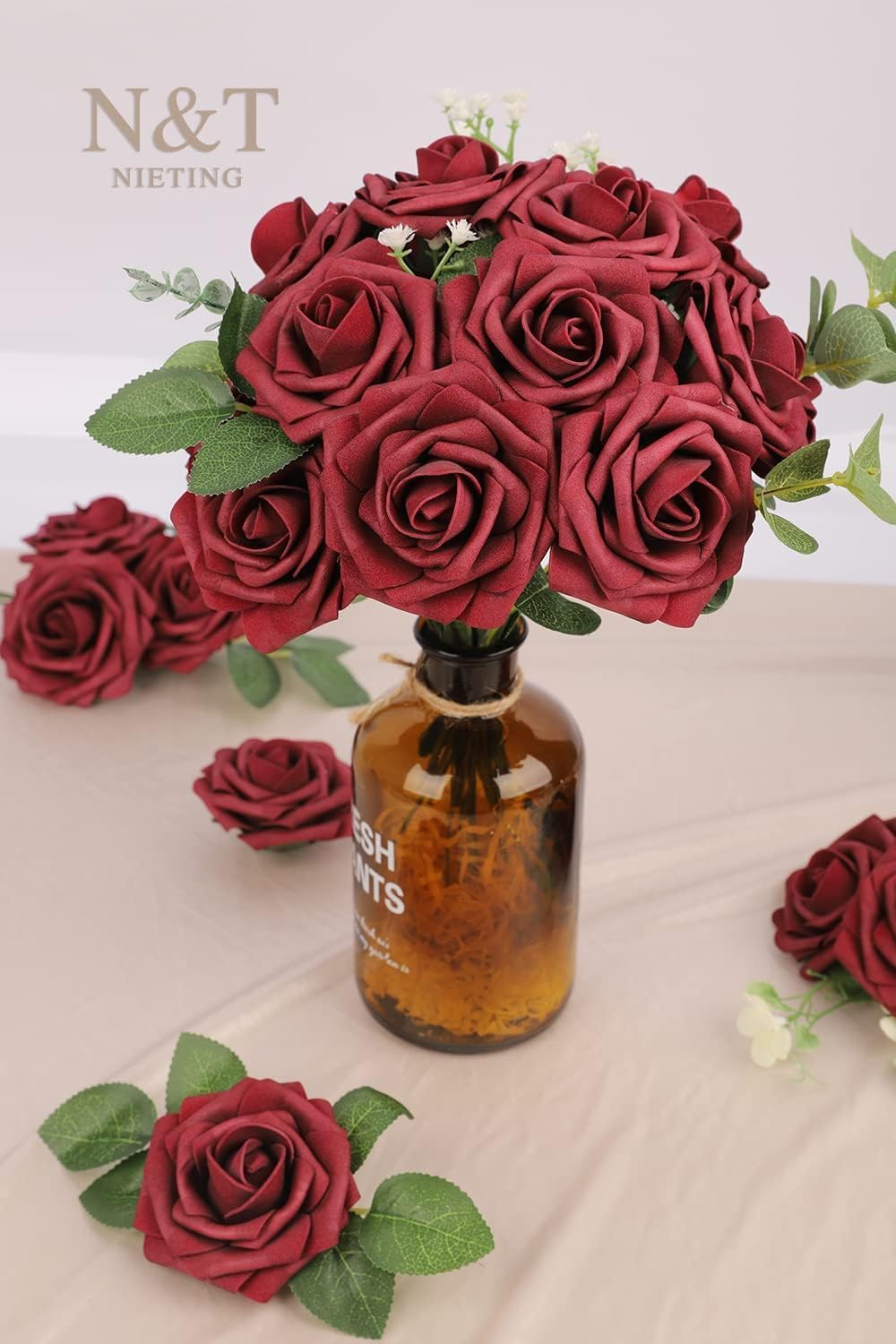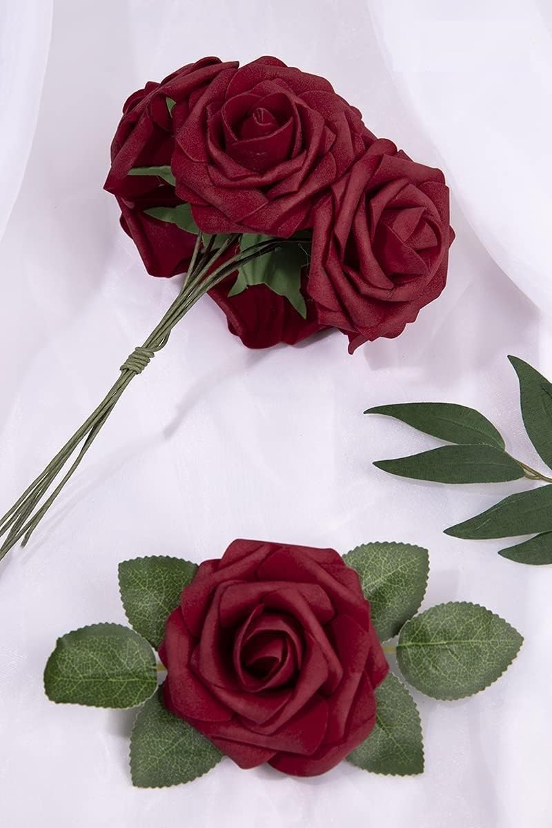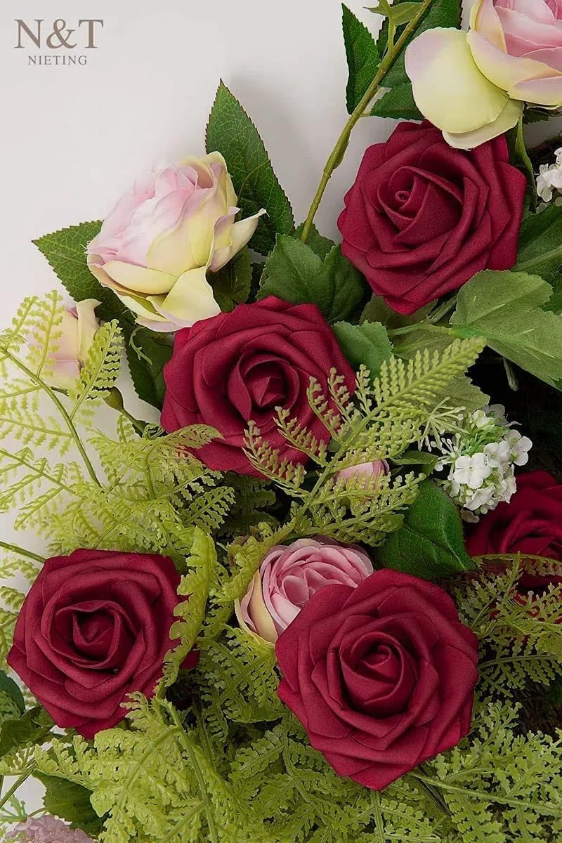 N&T NIETING Изкуствени рози, пакет от 25, декоративни цветя, изкуствени рози, със стъбла, за „Направи си сам“ сватби, Свети Валентин, Ден на майката, бебешки партита, букети, декорации за булчински дом, тъмночервени