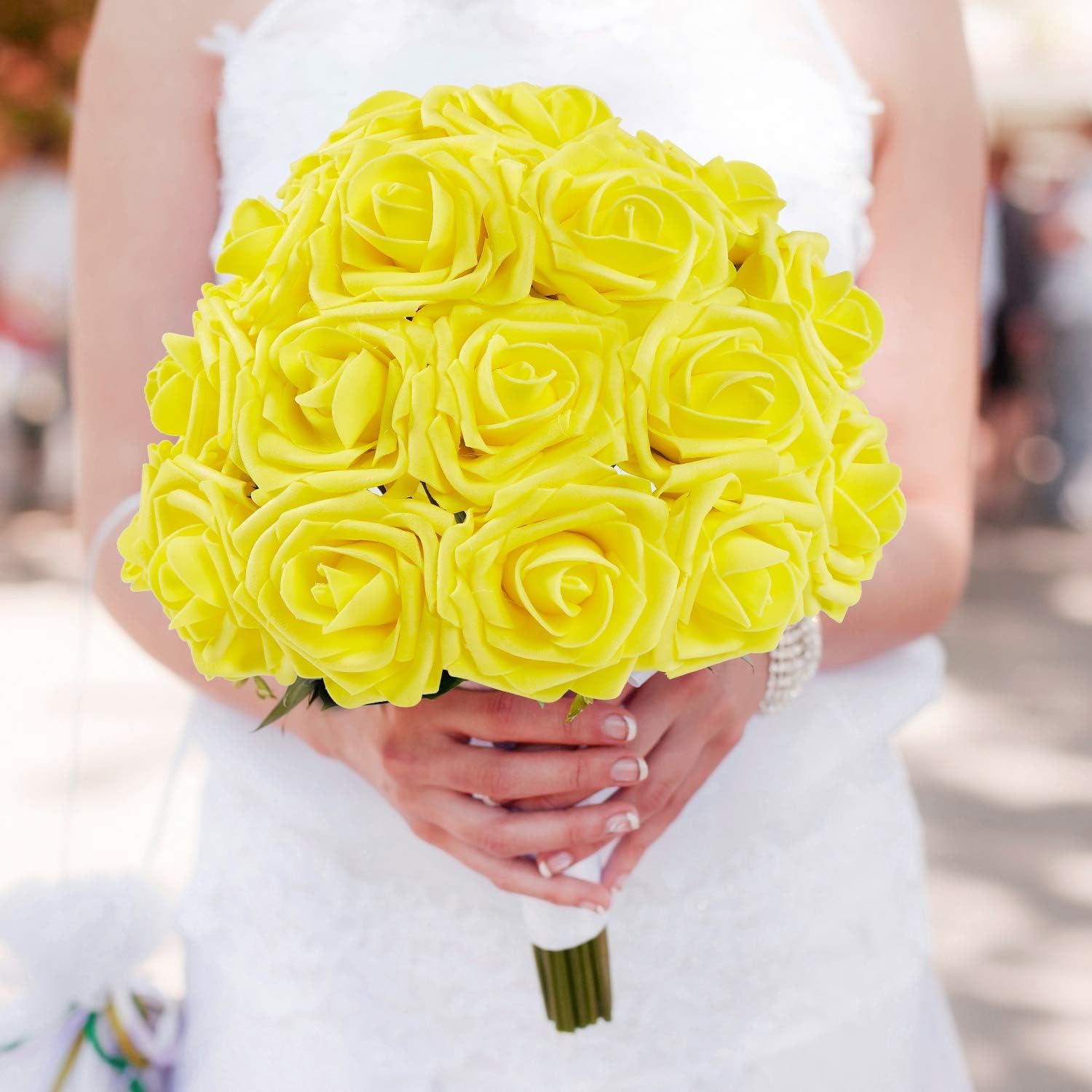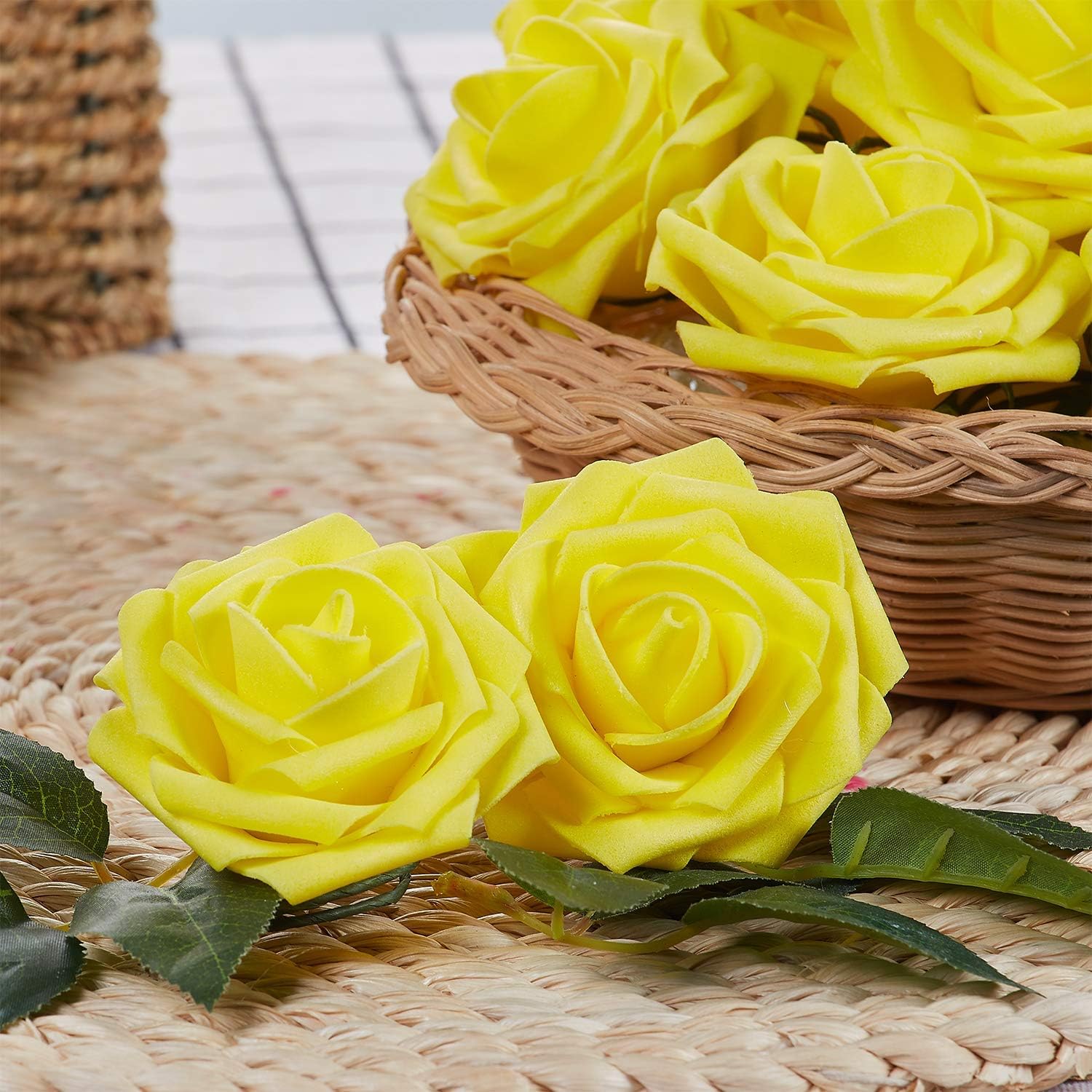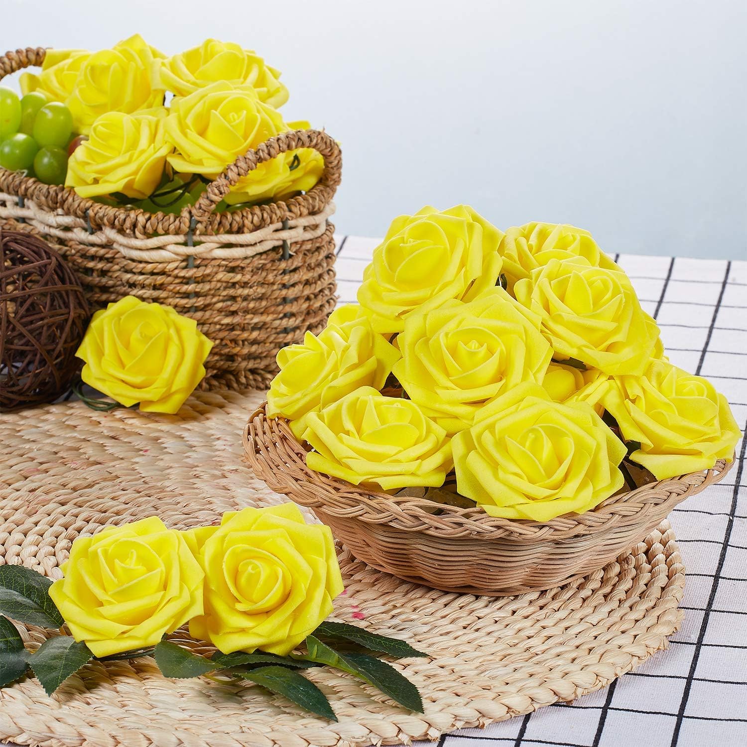 N&T NIETING Изкуствени рози, пакет от 25 декоративни цветя, рози от пяна, изкуствени рози със стъбла, сватбени букети „Направи си сам“, булчински, декорации за дома, жълти