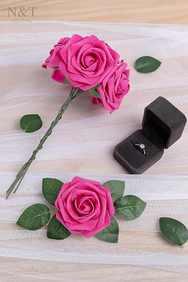 N&T NIETING Изкуствени рози, пакет от 25, изкуствени цветя, изкуствени рози със стъбла, за „Направи си сам“ сватбени букети, сватби, дом, декорации за Свети Валентин, ярко розово