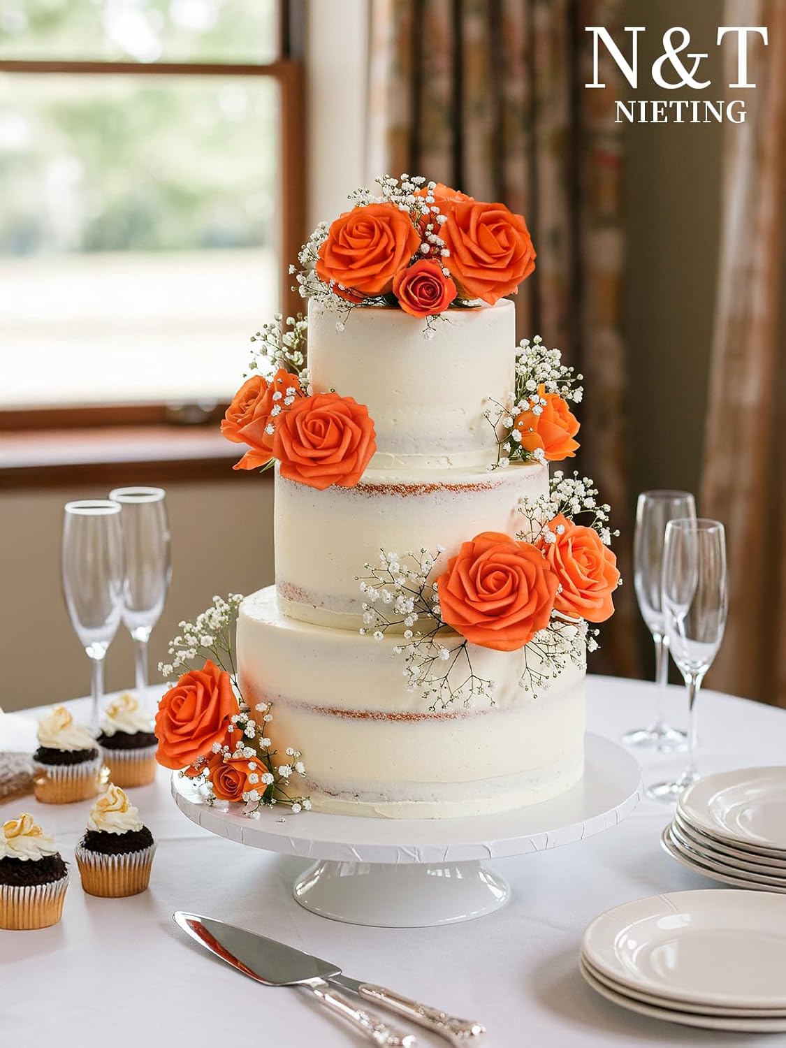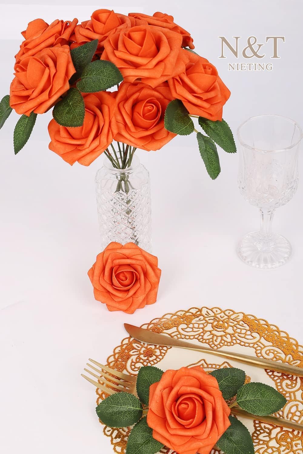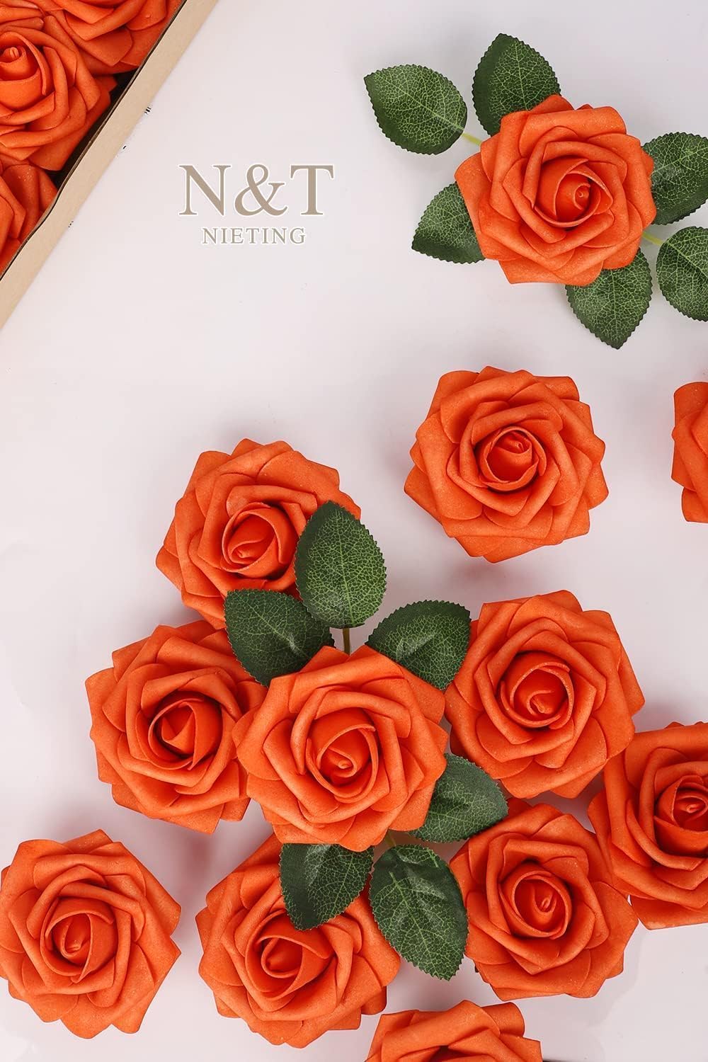 N&T NIETING Изкуствени сватбени цветя, пакет от 25 изкуствени рози със стъбло за Деня на майката, Направи си сам бохо декорация, централни елементи, цветни аранжировки, букети, маси, декорации за дома, есенно оранжево