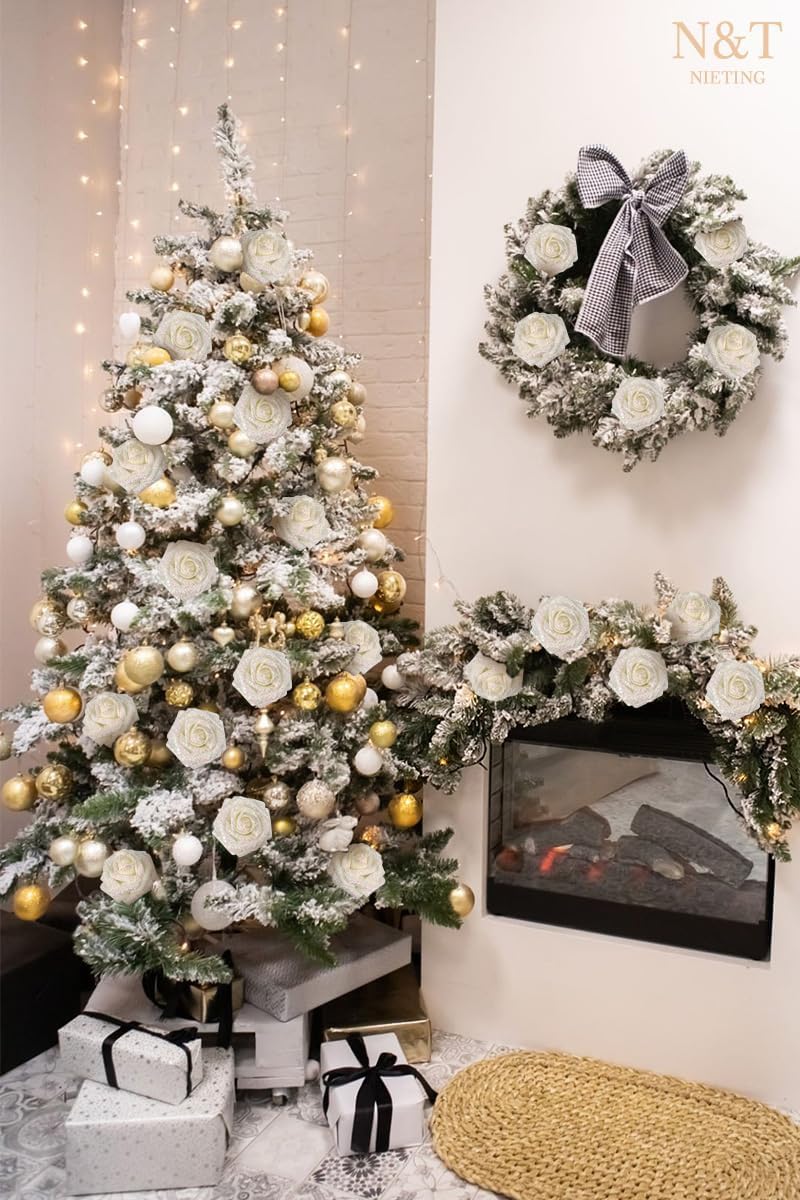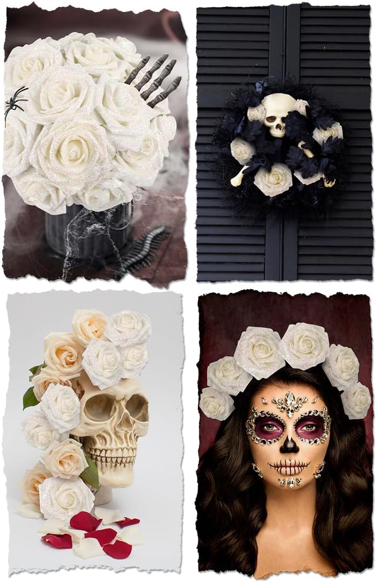 N&T NIETING Изкуствени цветя Блестяща роза, пакет от 25, Фалшиви рози със стъбла, истинско усещане, изкуствени рози от пяна за сватбени букети, партита, офис, бебешки партита, дом, коледна украса (бели)
