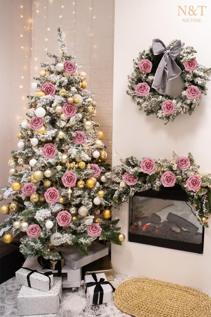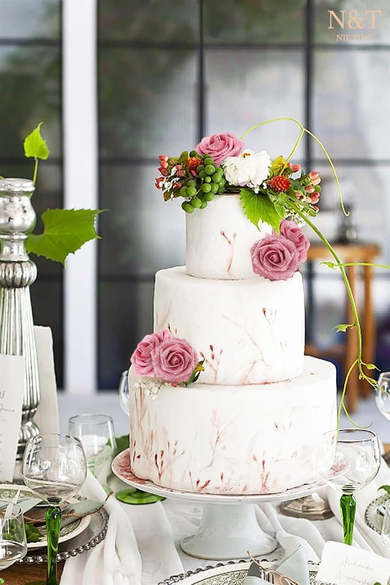 N&T NIETING Изкуствени цветя Блестящи рози, пакет от 25 изкуствени розови цветя „Направи си сам“ със стъбло за сватбени букети, централни елементи, аранжировки, парти, бебешки душ, коледна украса и домашен декор (розови)