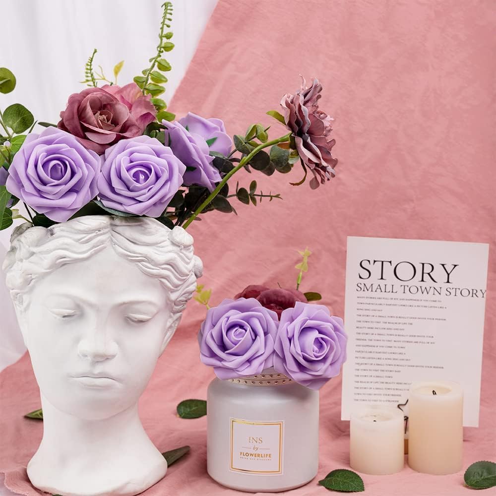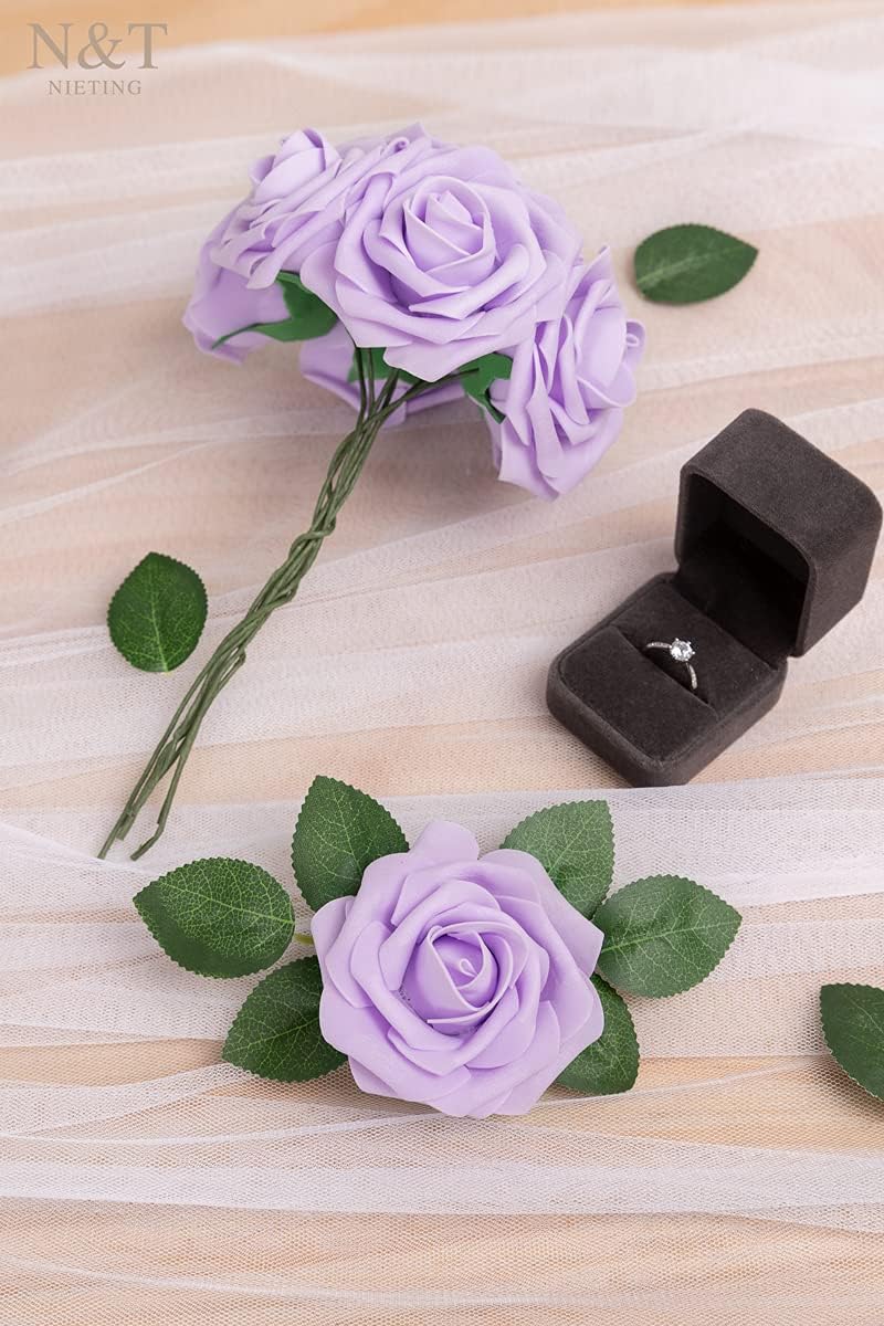 N&T NIETING Изкуствени цветя, пакет от 25, истински розови листенца със стъбла, за „Направи си сам“ сватбени букети, централни декорации за моминско парти, цветни аранжировки, парти маси, декорации за дома, светло лилаво