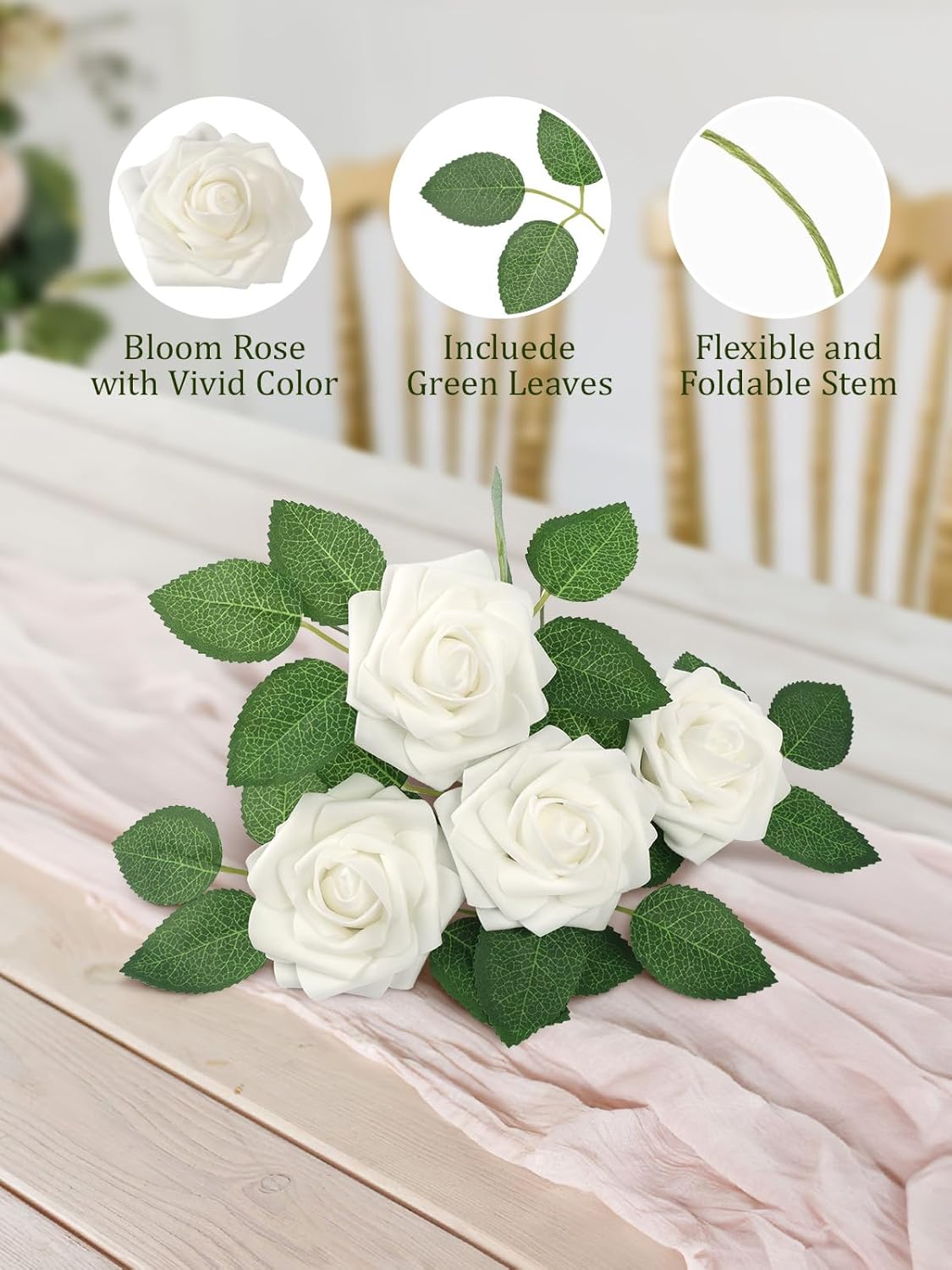 • Универсална: Розата е идеална за изработка на букети, централни декорации, топки за целуване, бутониери, цветя за торти или други цветни декорации, които искате да направите за сватби, партита, бебешки партита, годишнини или у дома. Добавете романтична, сладка атмосфера към вашето събитие.