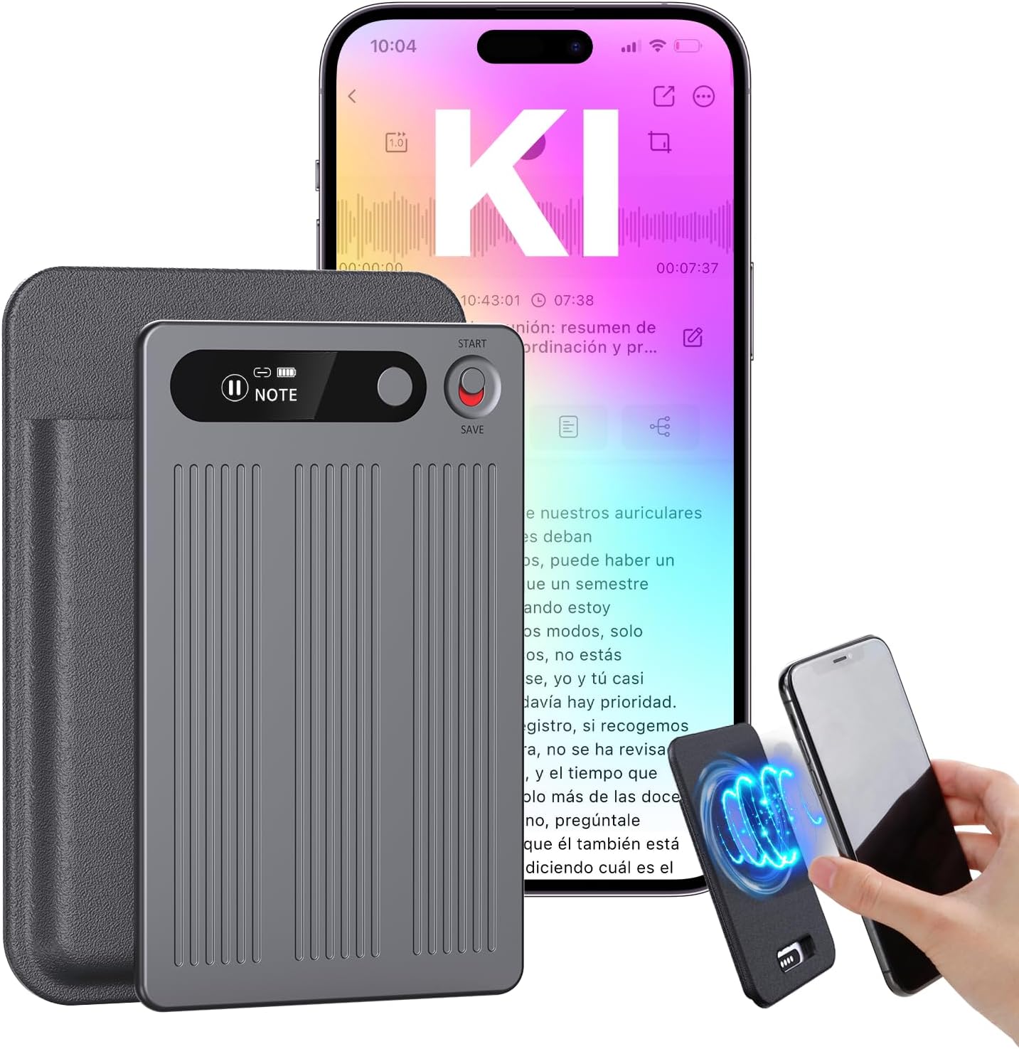 NUASI AI цифров гласов рекордер с калъф, транскрибиране и обобщение, управление с приложение, запис с едно докосване, поддържа превод на над 80 езика, 64GB памет, за телефонни разговори, срещи