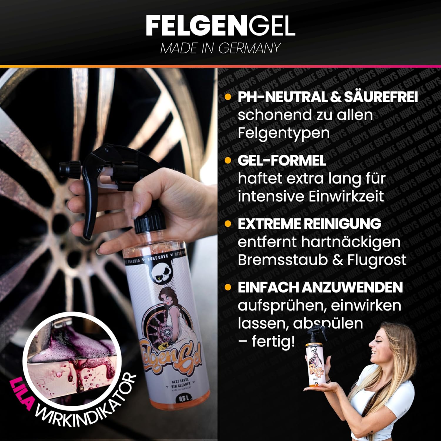 • Гел за почистване на джанти (500 мл) - без киселини, неутрален с pH и мощен срещу спирачен прах и ръжда; гъстият гел залепва оптимално; с активен лилав индикатор; подходящ за боядисани алуминиеви джанти, стоманени джанти и капачки за колела; произведен в Германия.