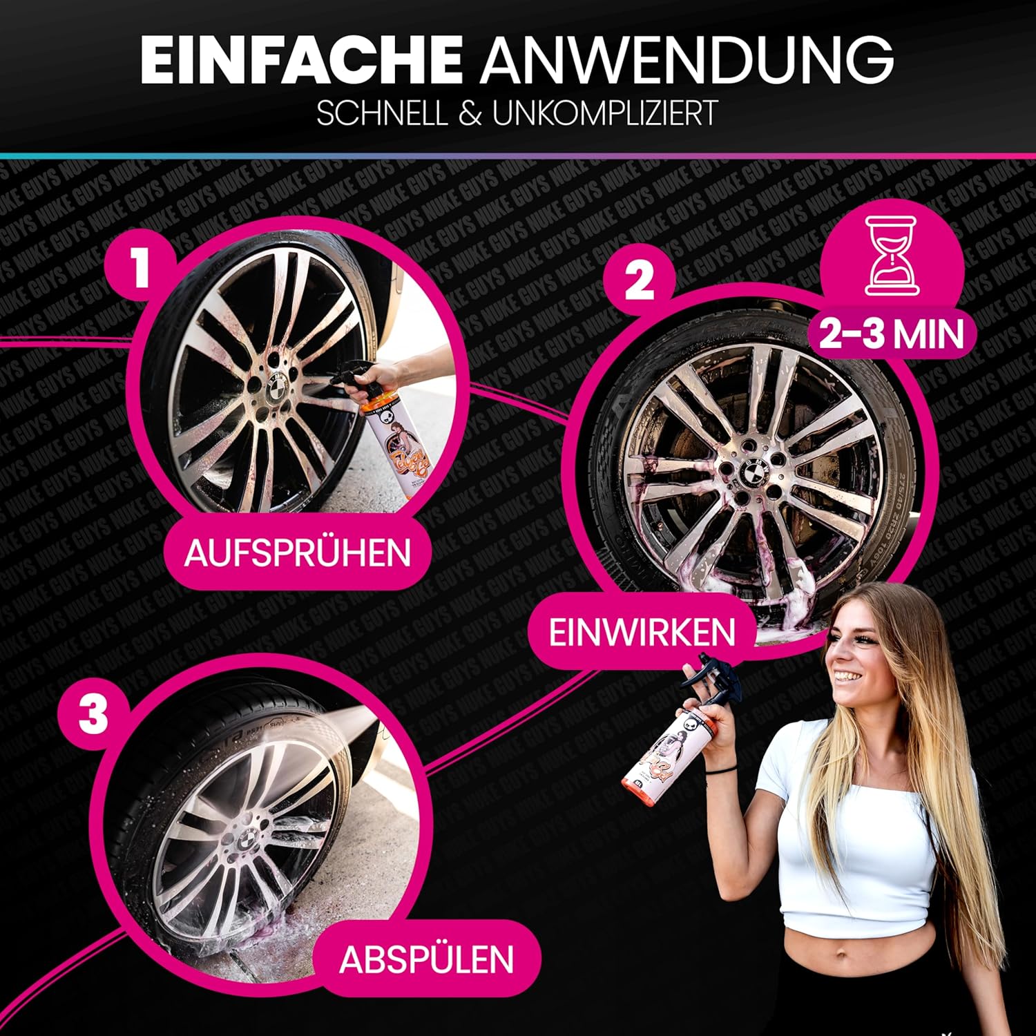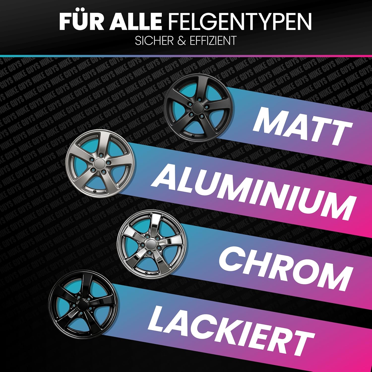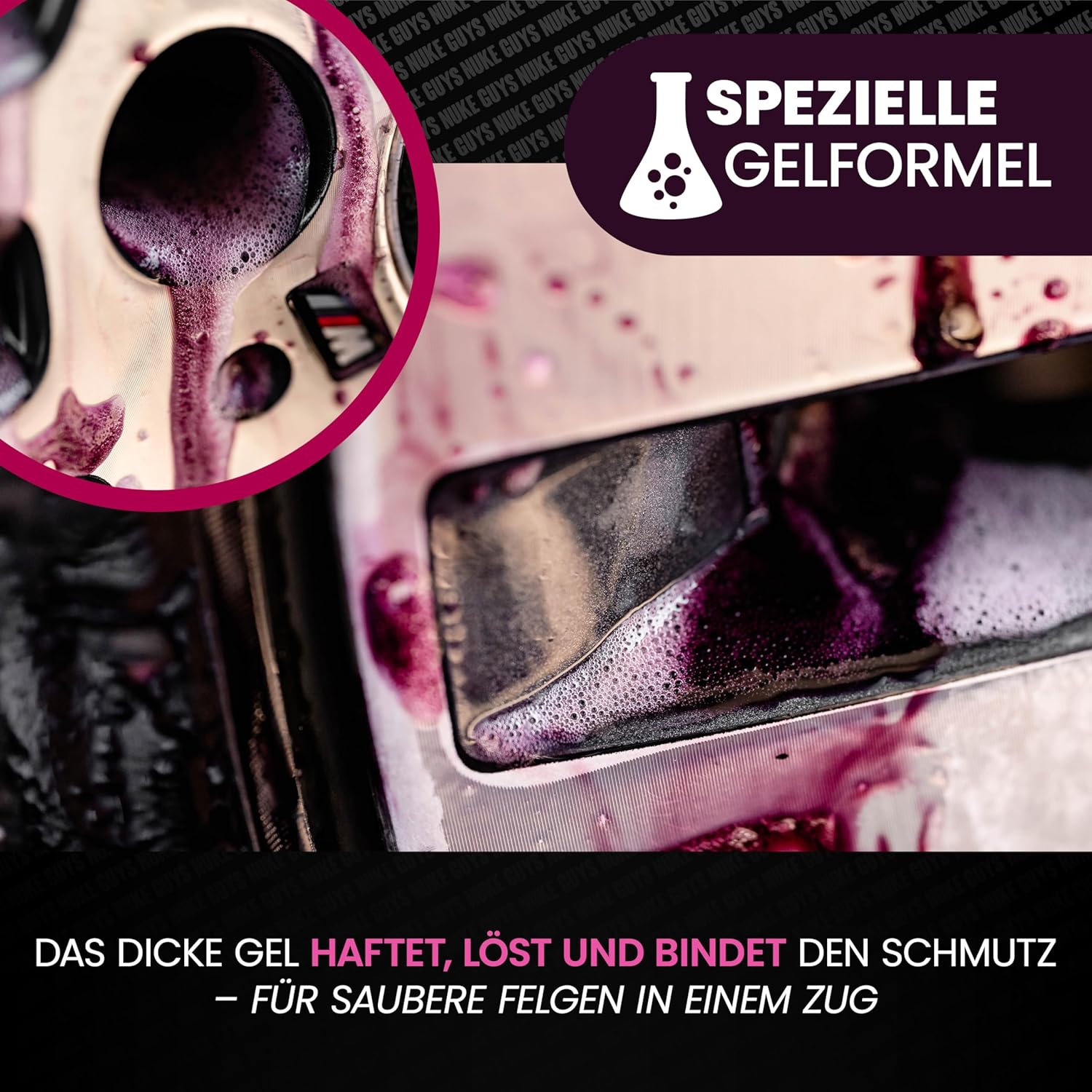 NUKE GUYS Почистващ препарат за джанти 500 мл с активен индикатор, силен почистващ препарат за алуминиеви джанти с блясък, pH неутрално почистване на джанти за автомобили и мотоциклети, ефикасен срещу прах и ръжда от спирачките
