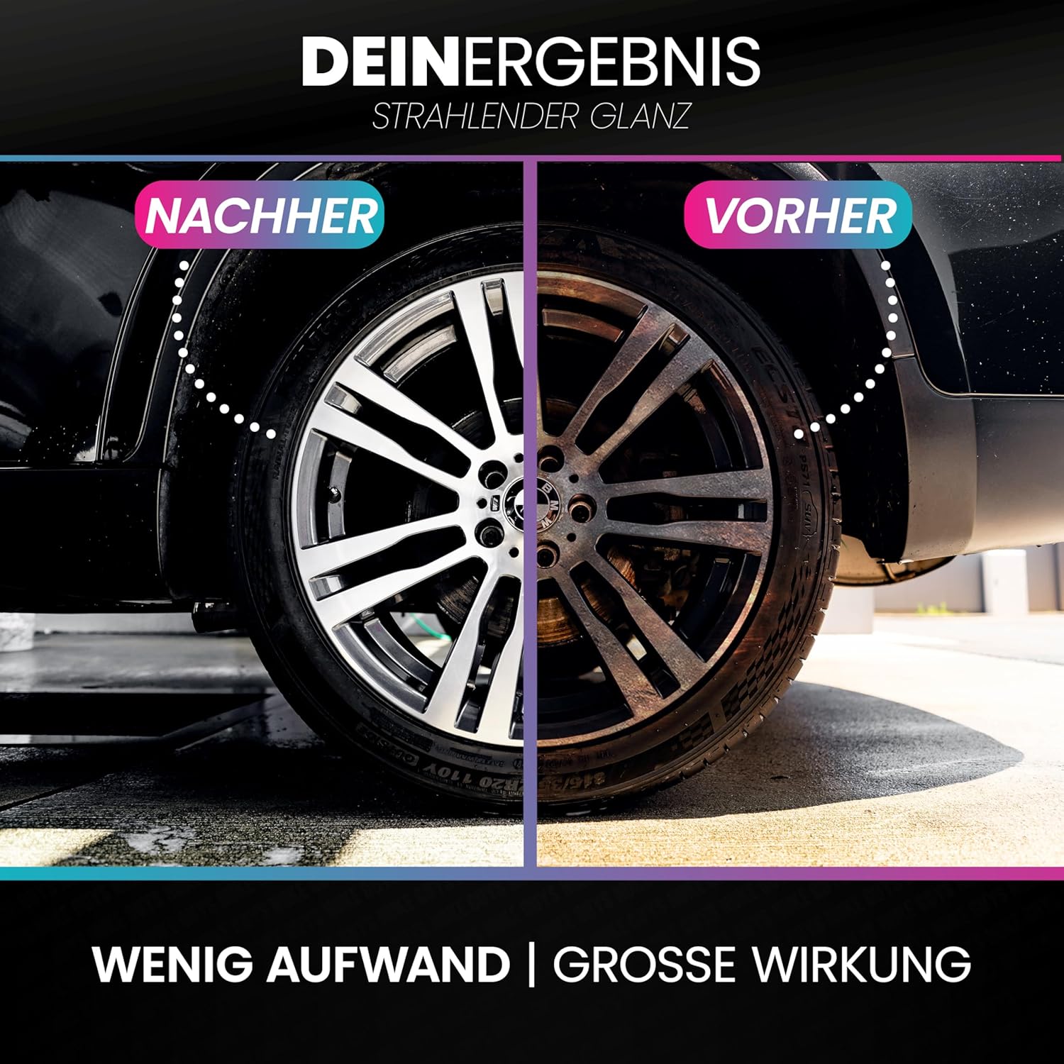 • Премиум комплект за перфектна грижа за джантите - Всички продукти могат да се комбинират перфектно за професионално почистване и устойчива защита; лесното нанасяне осигурява блестящо чисти джанти и дълготраен блясък.