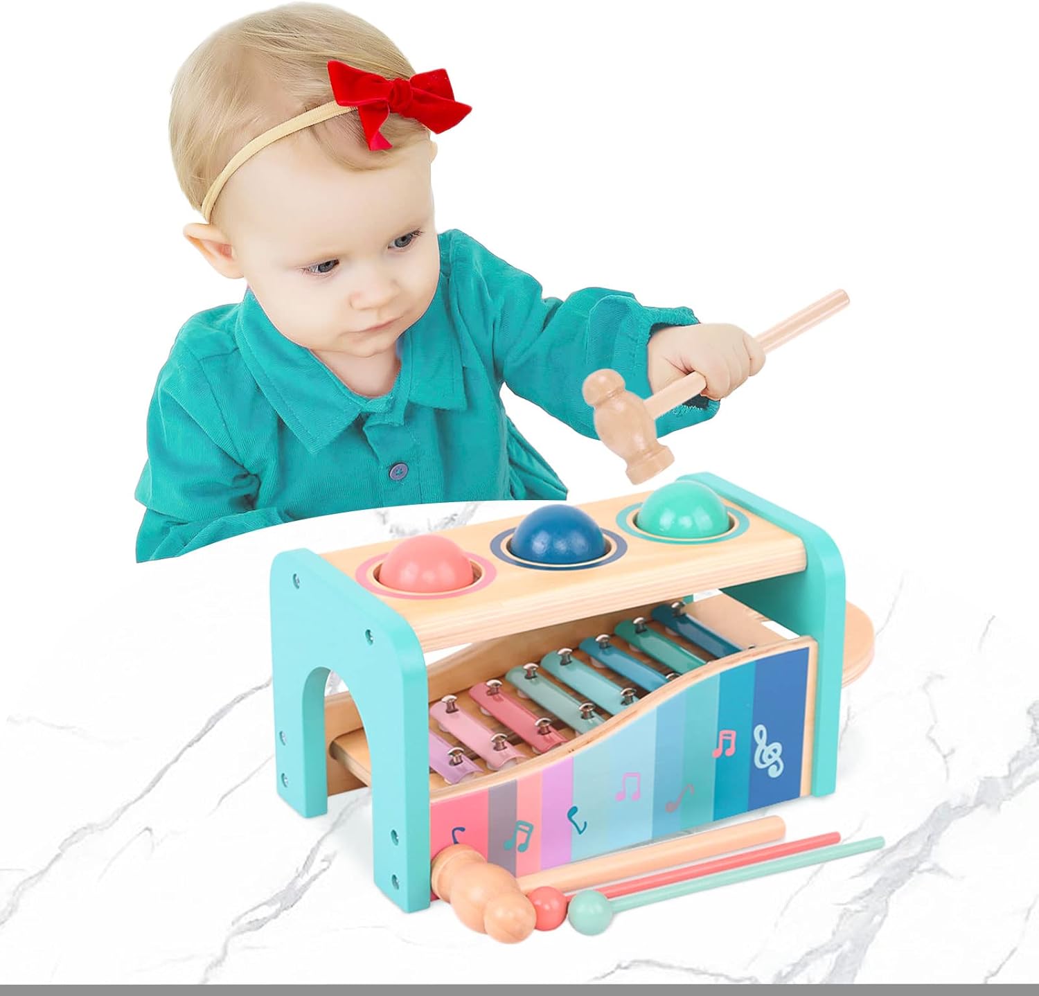 • 【Многофункционална играчка Монтесори】: Този бебешки ксилофон може да се играе по много начини. Когато топката звънти от почукването, децата могат да я вземат или да извадят клавиатурата и ксилофона, за да играят сами. Също така обновихме нашия продукт и проектирахме нова опаковка въз основа на различни отзиви. Той е перфектен подарък за вашето дете.