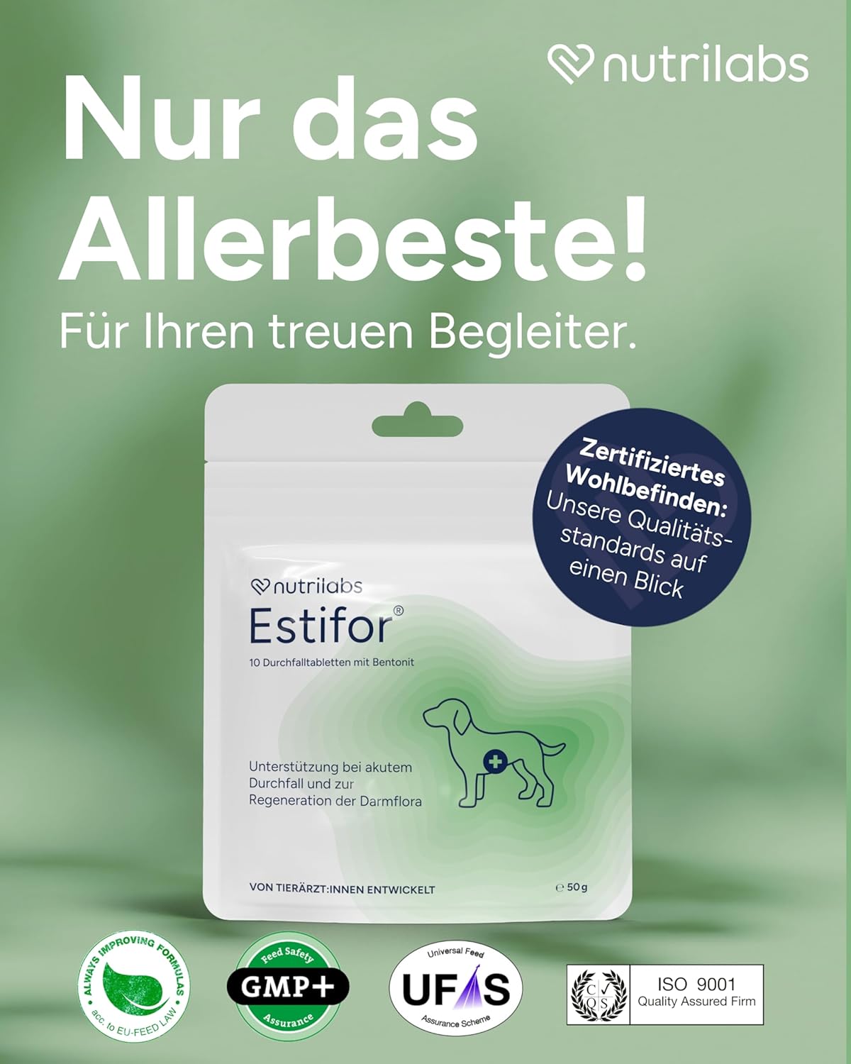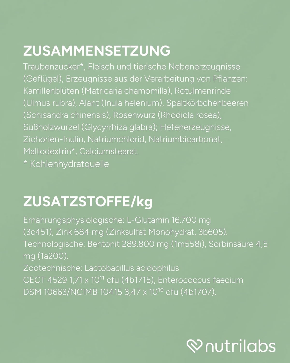 Състав: Птичи протеин (частично хидролизиран), царевично нишесте, ориз, яйчни продукти (сушени), продукти от мая (Saccharomyces cerevisiae), инулин от цикария (Cichorium intybus), продукти от преработката на растения: цветове от лайка (Matricaria chamomilla), кора от хлъзгав бряст (Ulmus rubra), оман (Inula helenium), шизандра (Schisandra chinensis), корен от женско биле (Glycyrrhiza glabra); пшеничен протеин