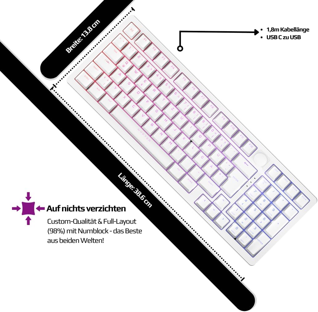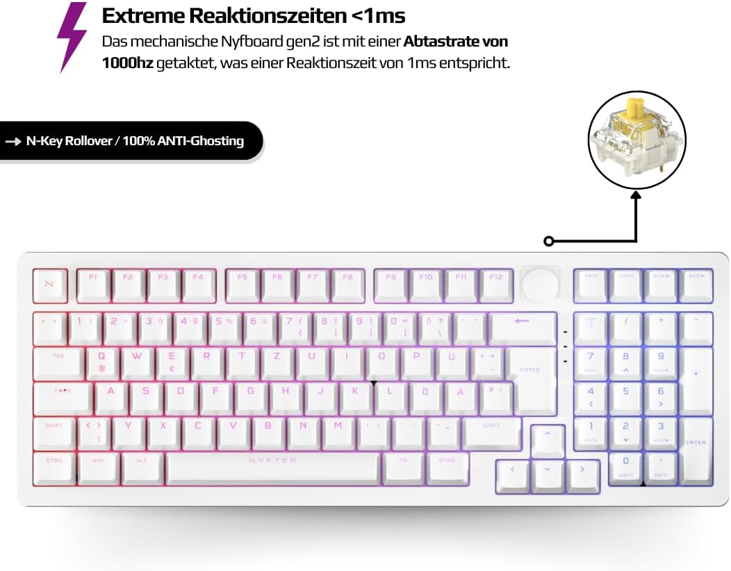 Nyfter - 98% геймърска клавиатура - двойно затихване, предварително смазани жълти превключватели Gateron, възможност за гореща смяна, 100% RGB осветление, ISO DE оформление NYFBOARD GEN2 геймърска клавиатура