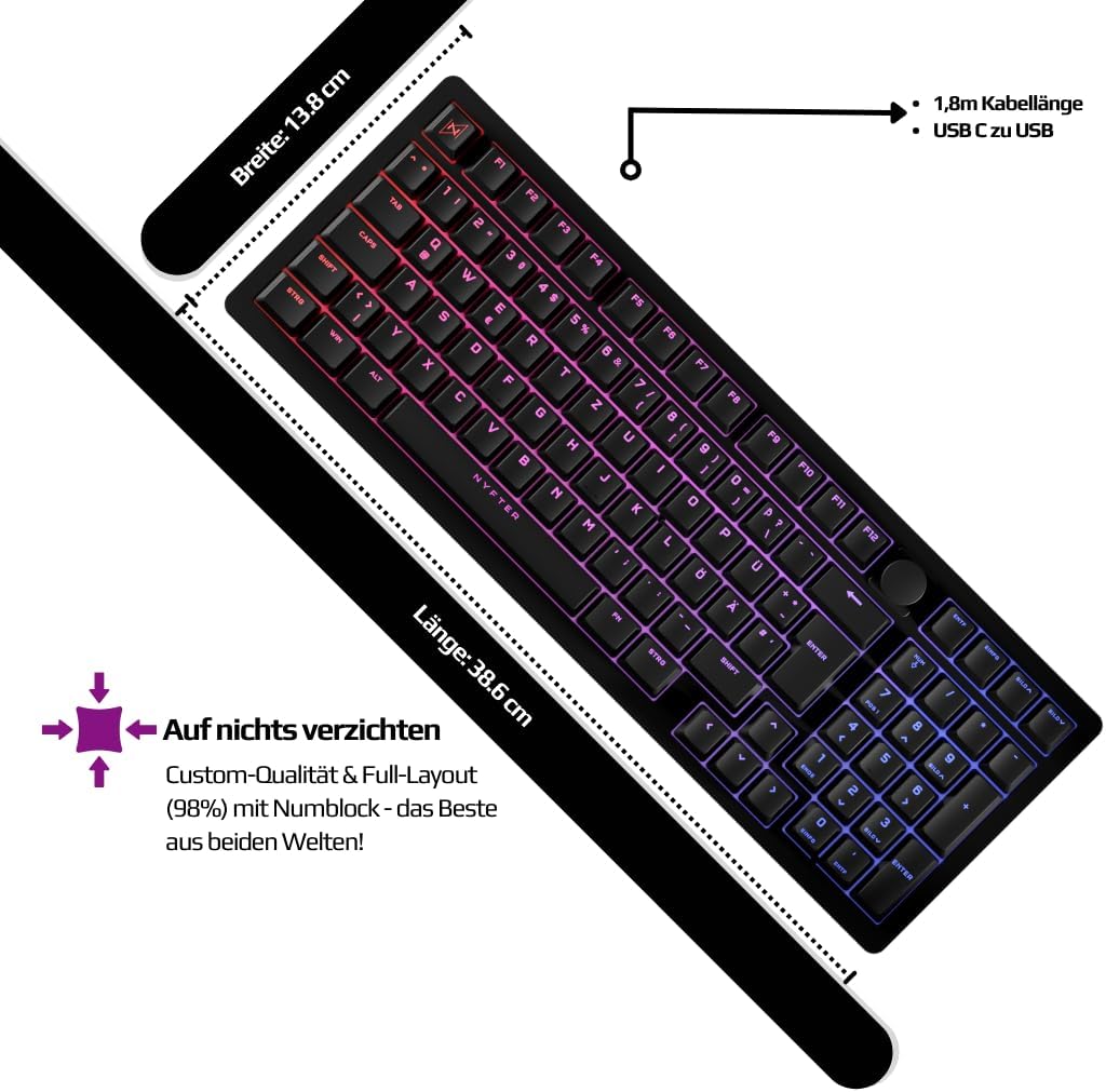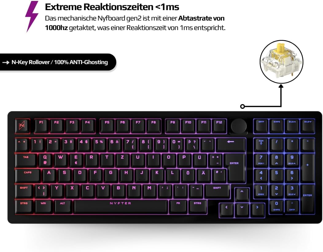 Nyfter - 98% геймърска клавиатура - двойно затихване, предварително смазани жълти превключватели Gateron, възможност за гореща смяна, 100% RGB осветление, ISO DE оформление NYFBOARD GEN2 геймърска клавиатура