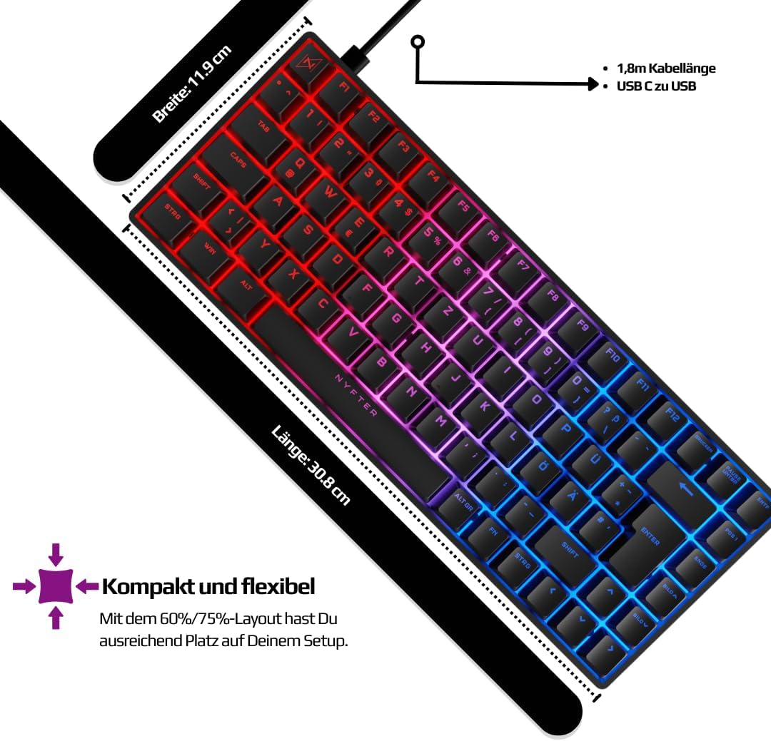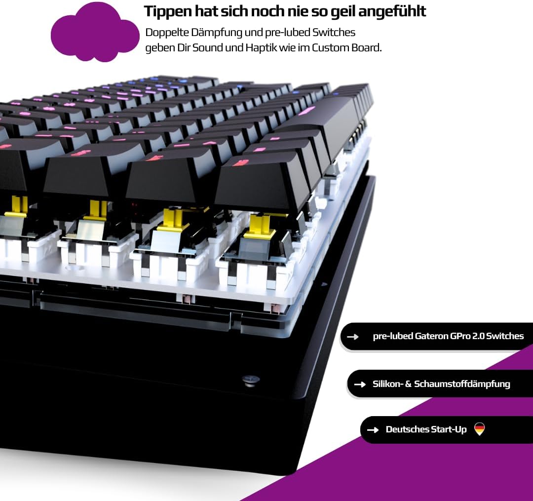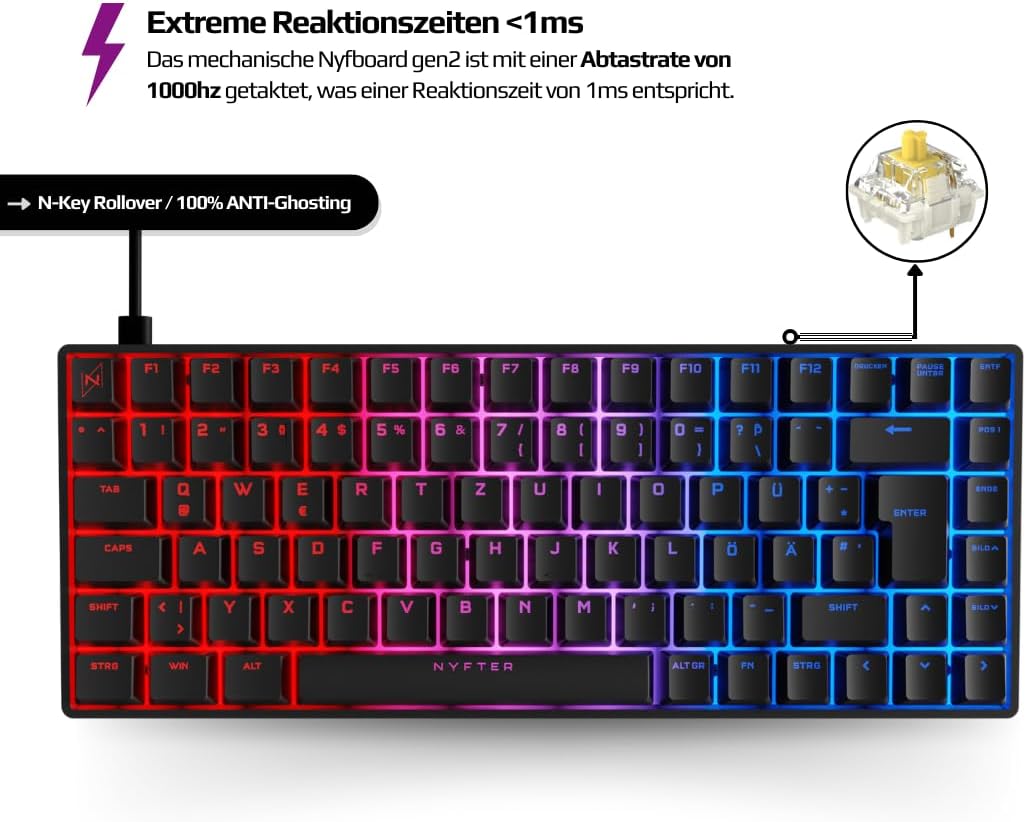 Nyfter - Геймърска клавиатура NYFTER GEN2 със 75% затихване - двойно затихване, предварително смазани жълти превключватели Gateron, възможност за гореща смяна, 100% RGB осветление, ISO DE оформление